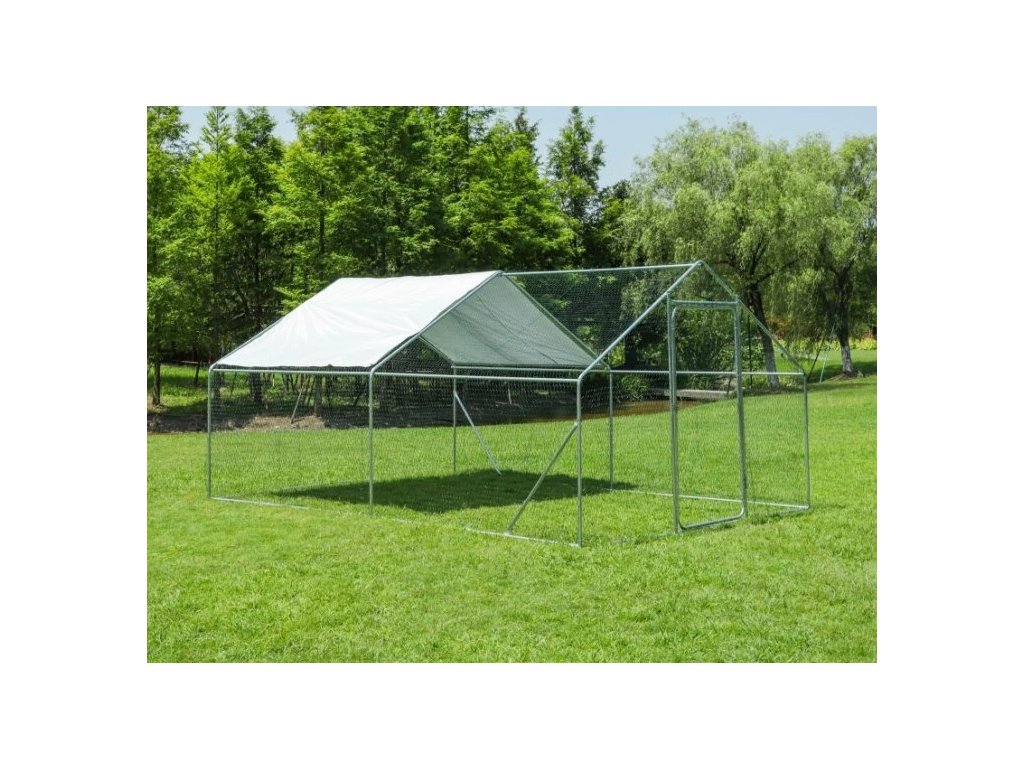 Robustní konstrukce z oboustranně pozinkovaných ocelových trubek Ø 27 mm zaručuje dlouhou životnost, zatímco poplastované pletivo chrání drůbež před útoky kun, lišek nebo dravců. Součástí je také stínící plachta, která poskytuje úkryt před sluncem a deštěm – ideální pro teplé i deštivé dny.