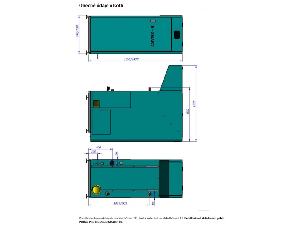 B-Smart 30 kW existuje se základním zásobníkem 150 l a rozšířeným 230 l. Přepočet na kilogramy je vždy orientační (záleží na sypné hustotě pelet), ale pro představu: 150 l bývá zhruba okolo 95–105 kg a 230 l zhruba okolo 145–155 kg.