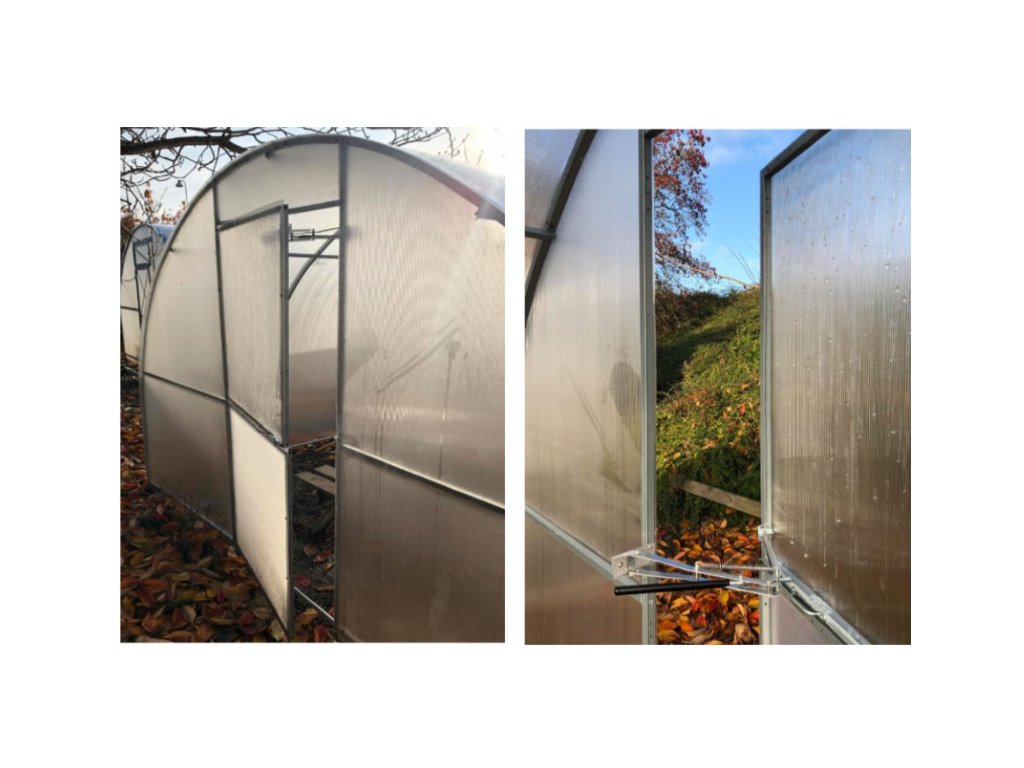 Pokud chcete použít otvírač na celé dveře, vždy doporučujeme dobře promyslet, zda vám po montáži zůstane dostatečný přístup do skleníku. Na čelní okna je to velmi praktické řešení, u celých dveří dává největší smysl hlavně u průchozích modelů.