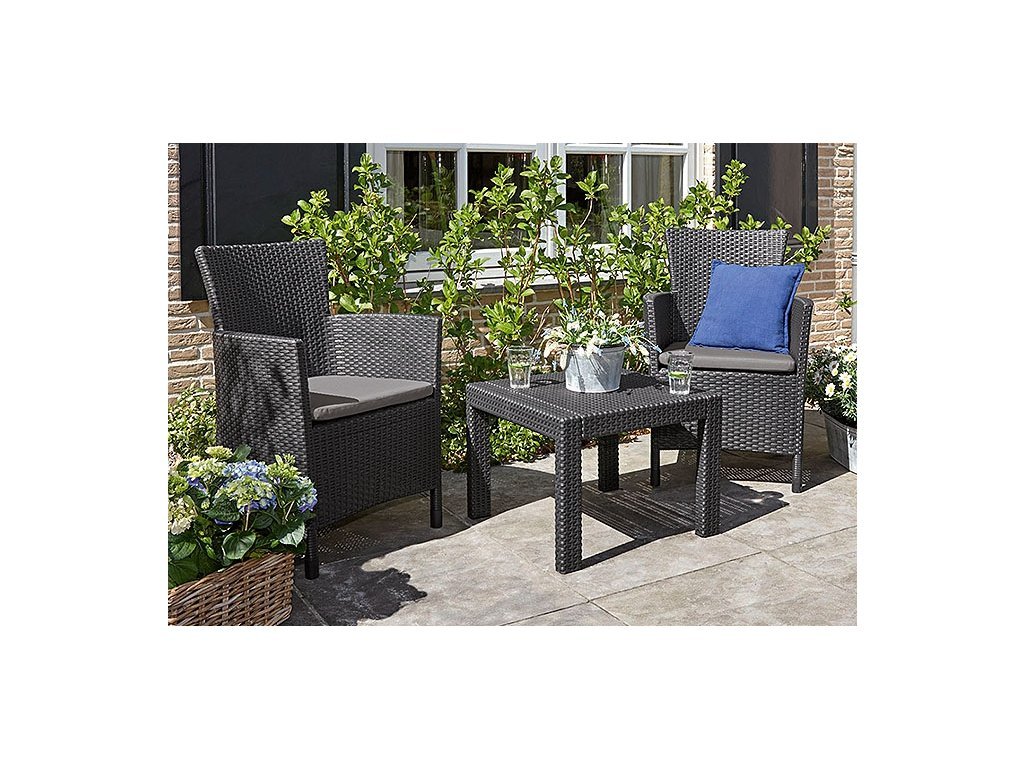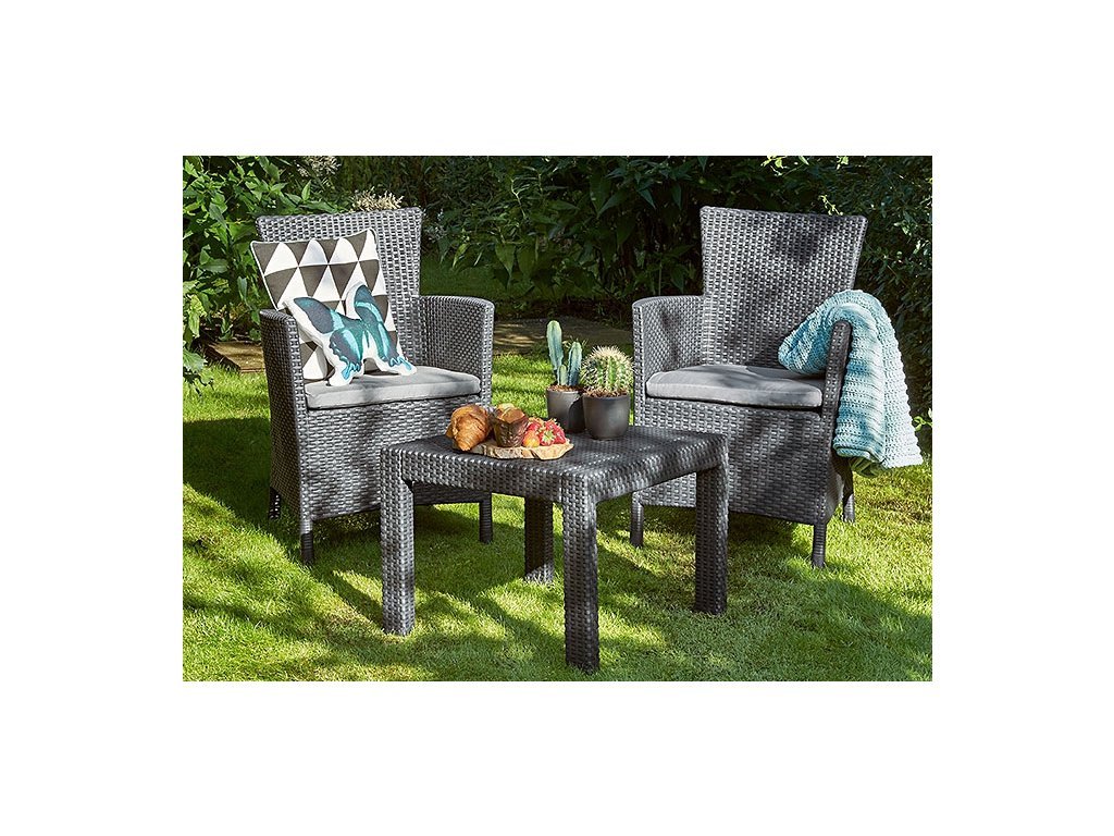 KomfortnÍ komplet zahradního nábytku z vysoce kvalitního plastu v imitaci přírodního ratanu. Pohodlná křesla s vysokou opěrkou jsou doplněna stylovým kávovým stolkem. Křesla jsou doplněna měkkými polstrovanými sedáky. Sestava je pro své rozměry vhodná na balkóny nebo menší terasy.