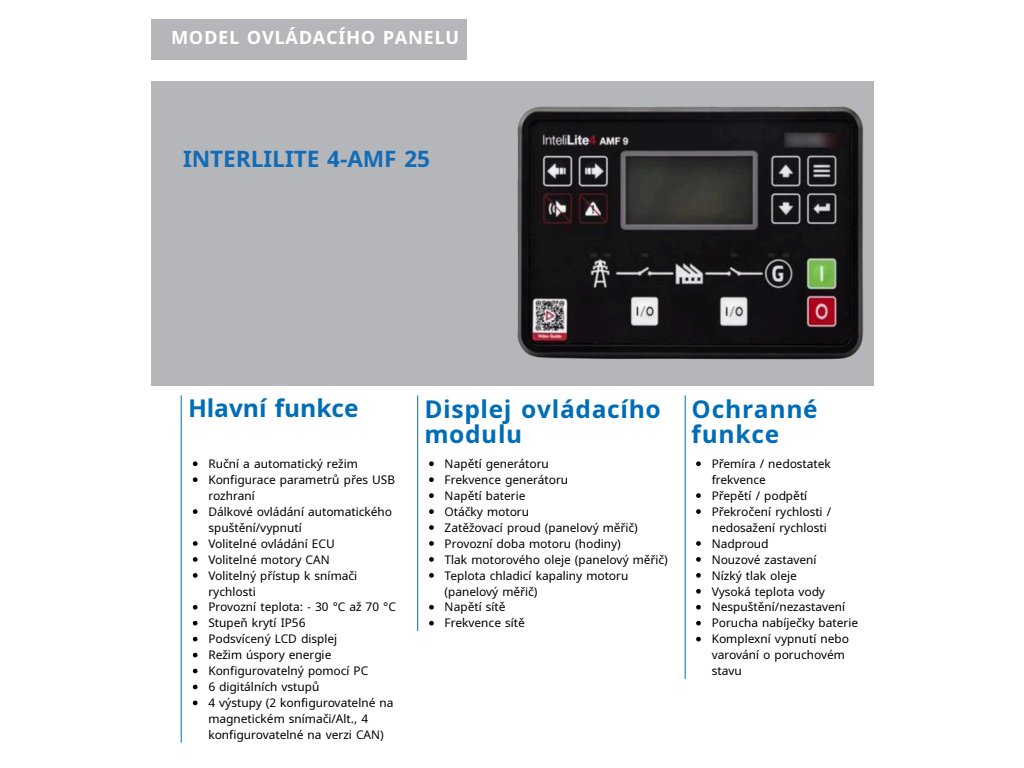 Součástí výbavy je moderní řídicí systém InteliLite 4 AMF s manuálním i automatickým režimem, USB konfigurací, dálkovým start/stop, podsvíceným LCD a IP56. Zobrazuje napětí/frekvenci sítě i generátoru, otáčky, provozní hodiny, proud, teplotu chladicí kapaliny a tlak oleje; nechybí logika AMF pro spolupráci se záskokem sítě (ATS). Ochrany zahrnují přepětí/podpětí, nad/podfrekvenci, nadproud, nouzové zastavení, nízký tlak oleje, vysokou teplotu vody a hlídání nabíjení baterie.