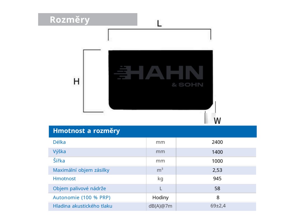 Rozměry a hmotnost: 2400 × 1000 × 1400 mm, 945 kg (typové provedení).