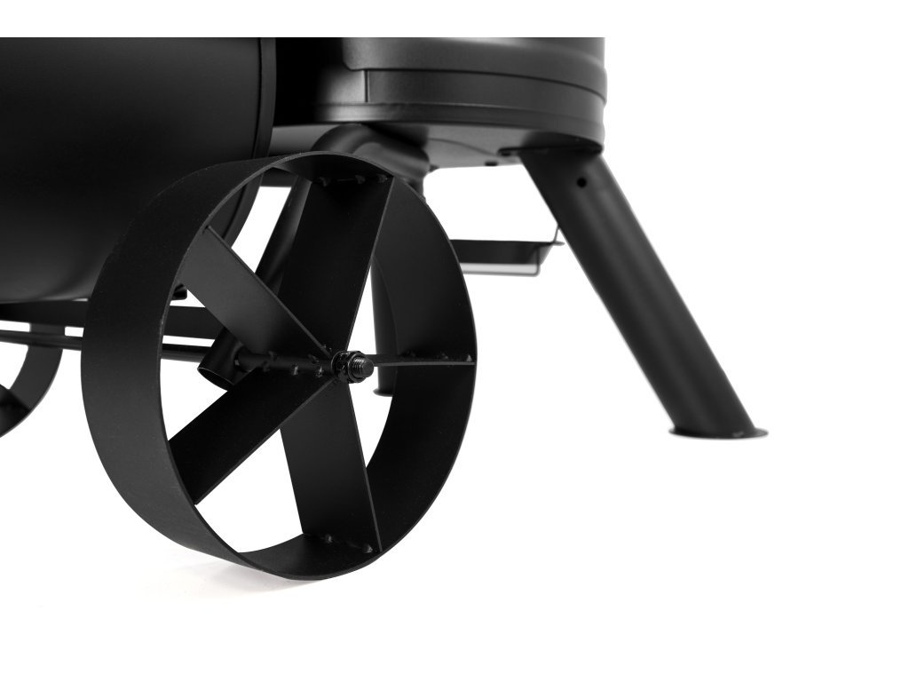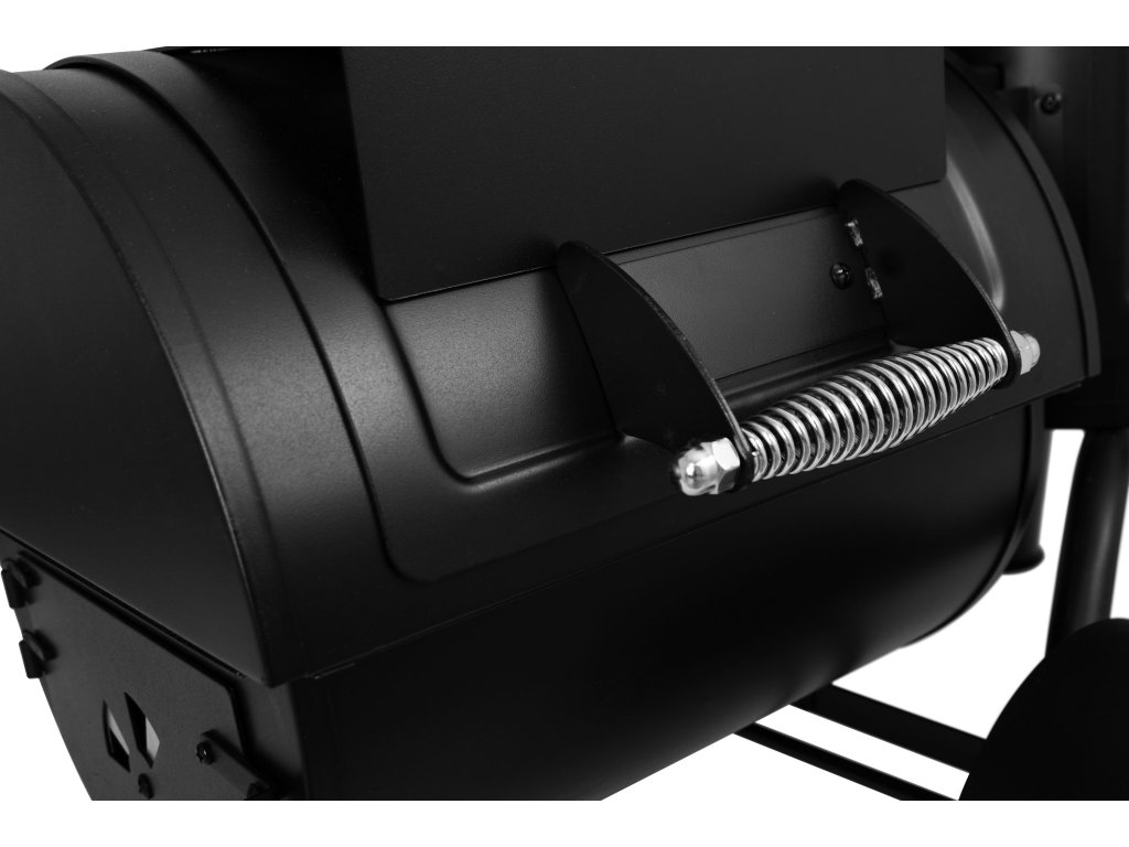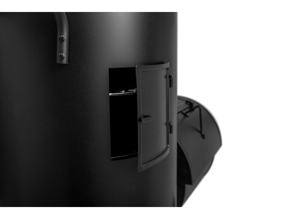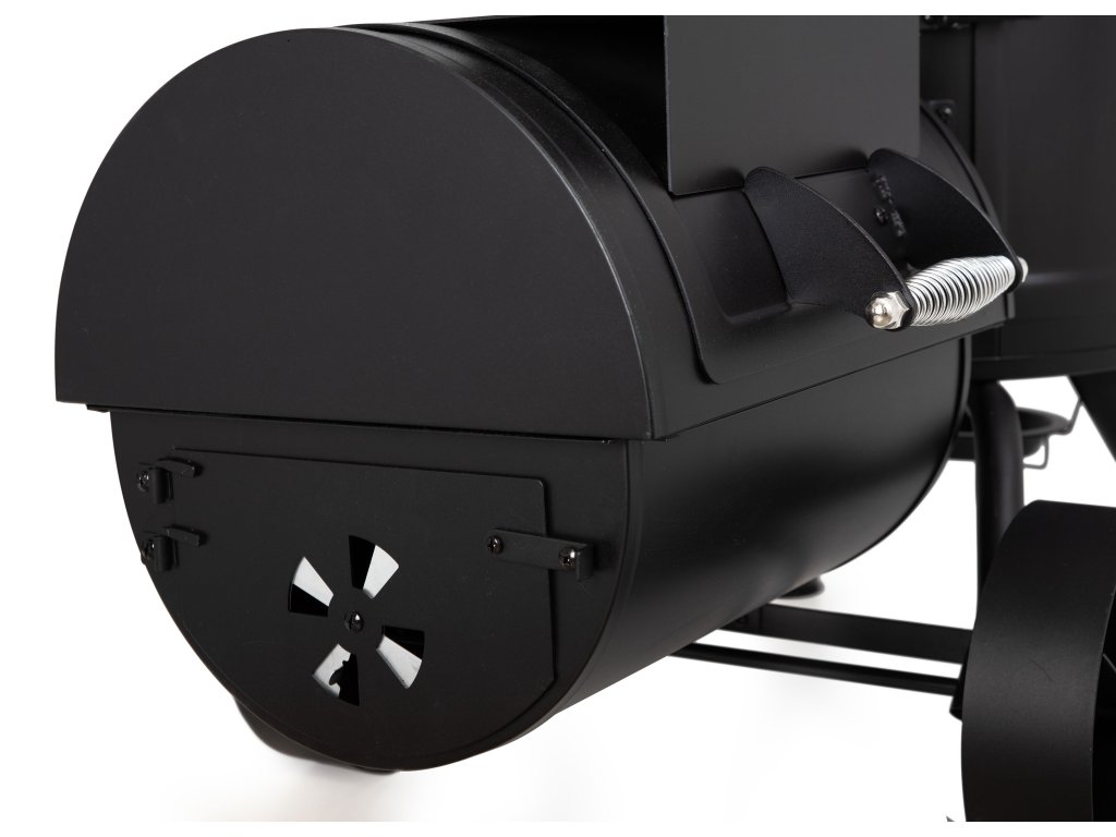 Grilovací část o velikosti 43 × 39 cm je vybavena víkem s bezpečnostními zarážkami, smaltovaným roštem a přístupem ke žhavému uhlí přes boční dvířka. Při grilování tak pohodlně doplníte palivo nebo vyberete popel bez složité manipulace.
