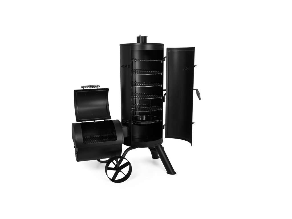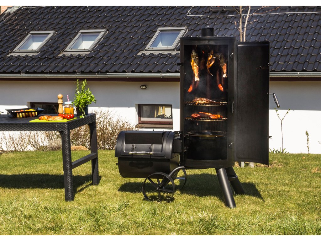 Díky samostatnému grilovacímu topeništi a objemné udírně lze využívat všechny funkce současně nebo nezávisle.