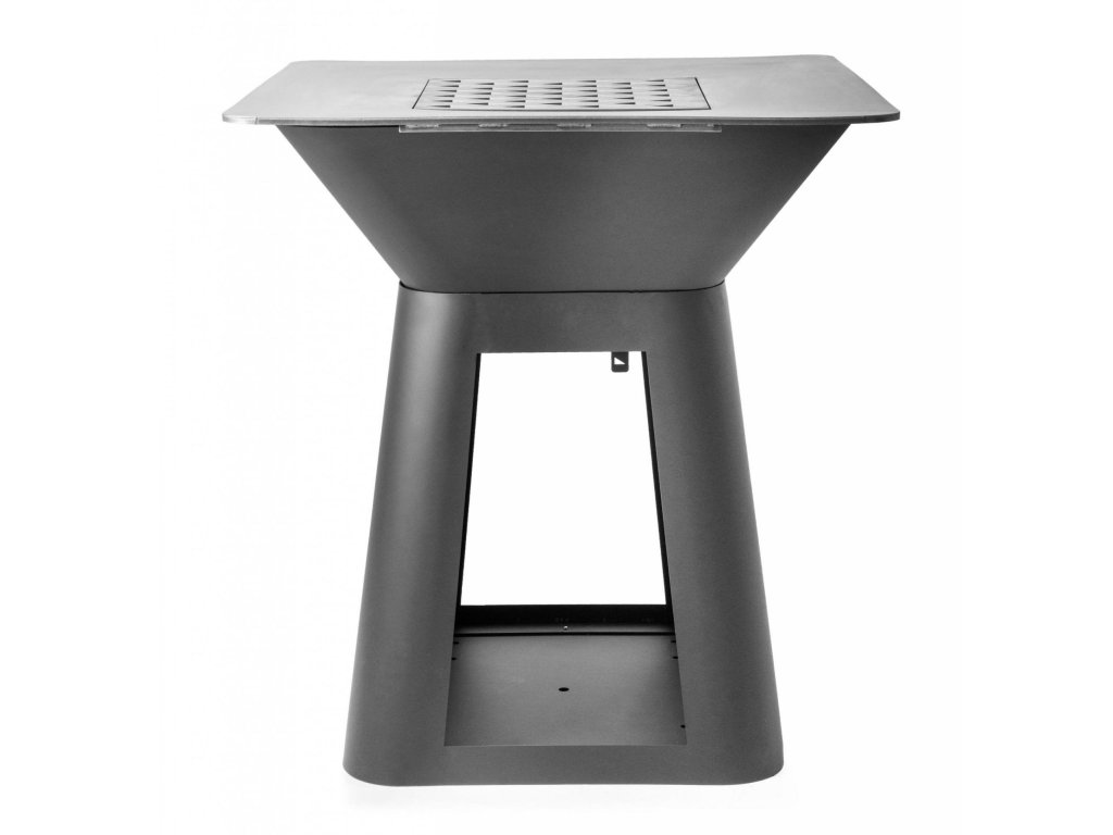Spodní část grilu slouží jako skladovací prostor na dřevo, horní tvoří topeniště s výsuvným popelníkem a hlavní dominantou je masivní plancha s jemným sklonem do středu pro efektivní odvod tuků a snadné čištění.