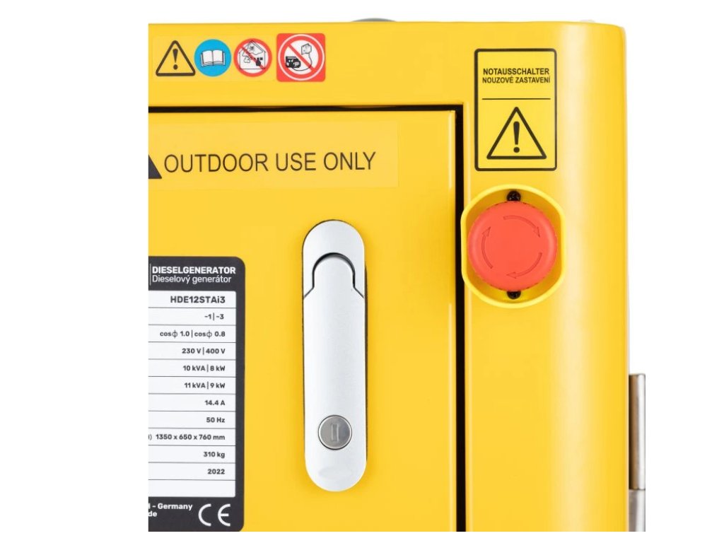 Silný a odolný dieselový generátor pro nepřetržitý i záložní provoz. HDE12STAi3 kombinuje jednofázový i třífázový režim (230/400 V), AVR stabilizaci výstupu, vodou chlazený dvouválcový motor 794 cm³ a protihlukové opláštění s hladinou hluku 72 dB. Velká nádrž 26 l zajistí až 12 hodin chodu na jedno natankování. Splňuje aktuální emisní požadavky EURO V.