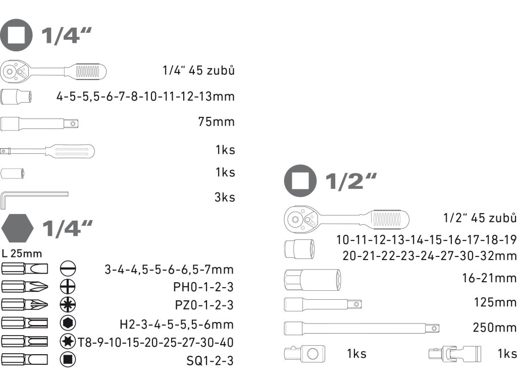 hlavice nástrčné: | 1/4": 4-5-5,5-6-7-8-10-11-12-13mm, 1/2": 10-11-12-13-14-15-16-17-18-19-20-21-22-23-24-27-30-32mm |