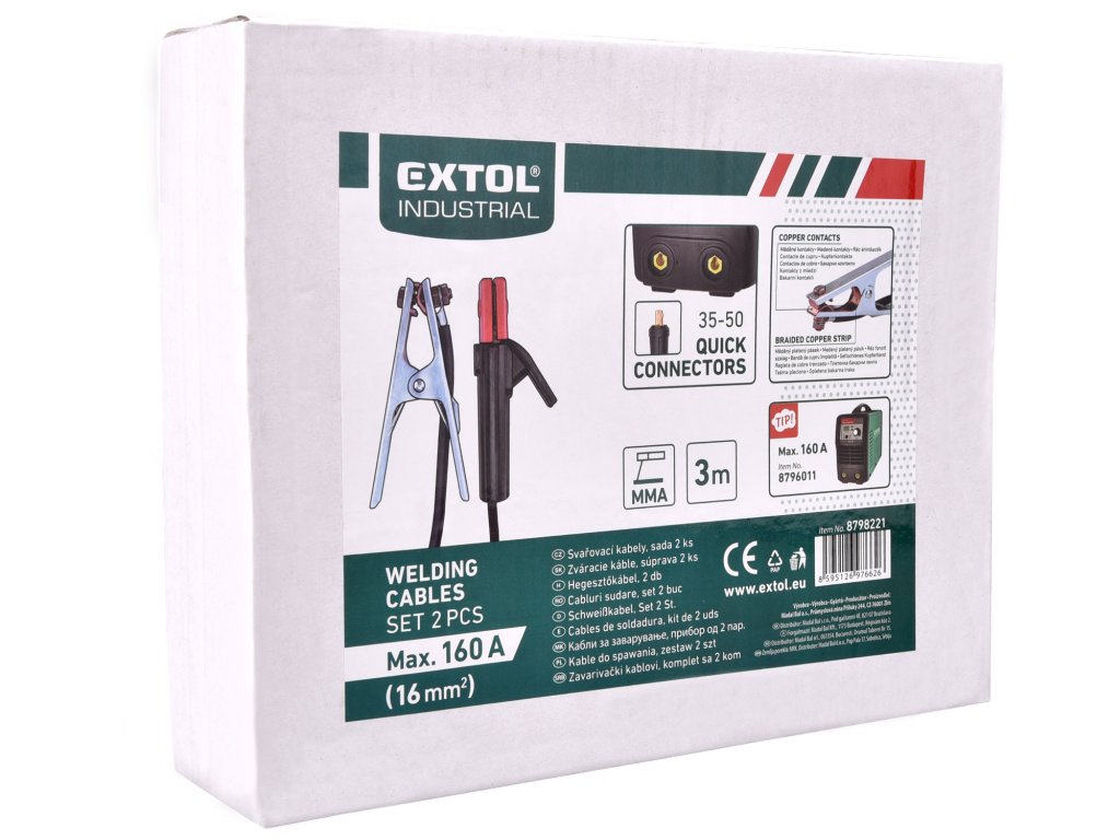 Tyto svařovací kabely od společnosti Extol Industrial jsou určeny pro svařování obalovanou elektrodou (metoda MMA) s připojením ke zdroji svařovacího proudu, který je vybaven připojovacími rychlospojkami (konektory) 35-50. Zemnicí svorka svařovacího kabelu má kontaktní části v měděném provedení spojené pleteným měděným páskem.
