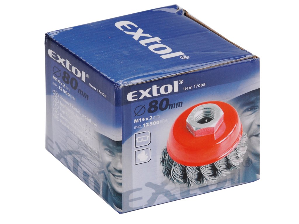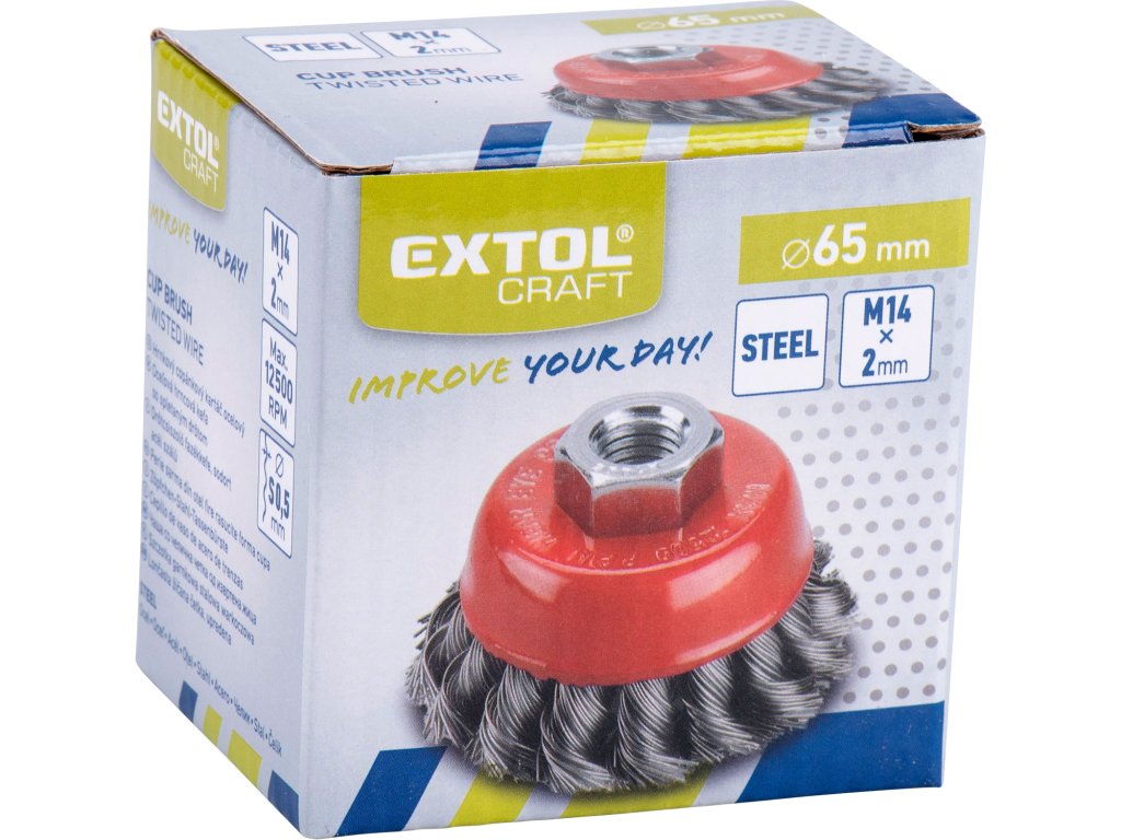 Řada technických kartáčů Extol nabízí široký výběr kartáčů pro všestranné nasazení, např. čištění povrchů materiálů, k odstraňování barev, nečistot, rzi, houževnatých nánosů, ke zdrsňování, odjehlování, odokujování apod. Upínání na úhlové brusky pomocí matice M14 a na vrtačky pomocí stopky o průměru 6mm.Doplňkové parametry