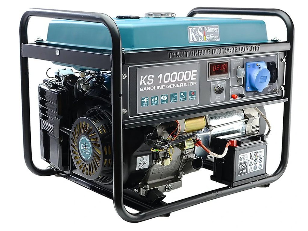 Könner & Söhnen KS 10000E je robustní jednofázová benzínová elektrocentrála 230 V s výkonem 7,5 kW, AVR stabilizací, měděným alternátorem a dlouhou výdrží. Skvělá volba pro domácnosti, dílny i náročné práce v terénu – když potřebujete spolehlivý a silný zdroj 230 V.