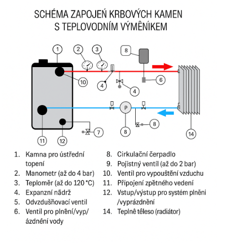 - Teplovodní výměník (22 l) – efektivní distribuce tepla do radiátorů či podlahového topení, možnost vytápění více místností i vzdálenějších částí objektu.