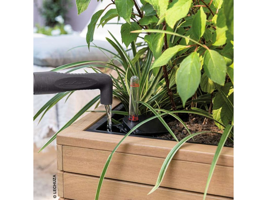 Součástí je kompletní zavlažovací set s měrkou hladiny vody, dnem pro nádrž a drenážním médiem Lechuza PON. Květina si o vodu „řekne sama“ – rostlina odebírá pouze tolik, kolik potřebuje, a přebytečná dešťová voda je odváděna pryč díky výpustnému ventilu. Ideální řešení i pro venkovní použití.