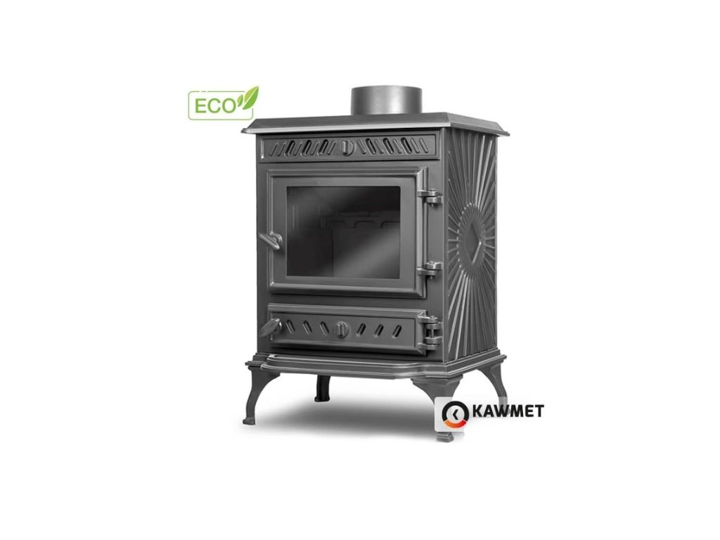 KAWMET P3 jsou teplovzdušná krbová kamna, která předávají teplo sáláním z litinového pláště a zároveň konvekcí – ohřátý vzduch stoupá vzhůru kolem topeniště a rovnoměrně prohřívá místnost. Jmenovitý výkon 7,4 kW a vytápěcí schopnost cca 74 m² jsou ideální pro menší domy, byty nebo chalupy.