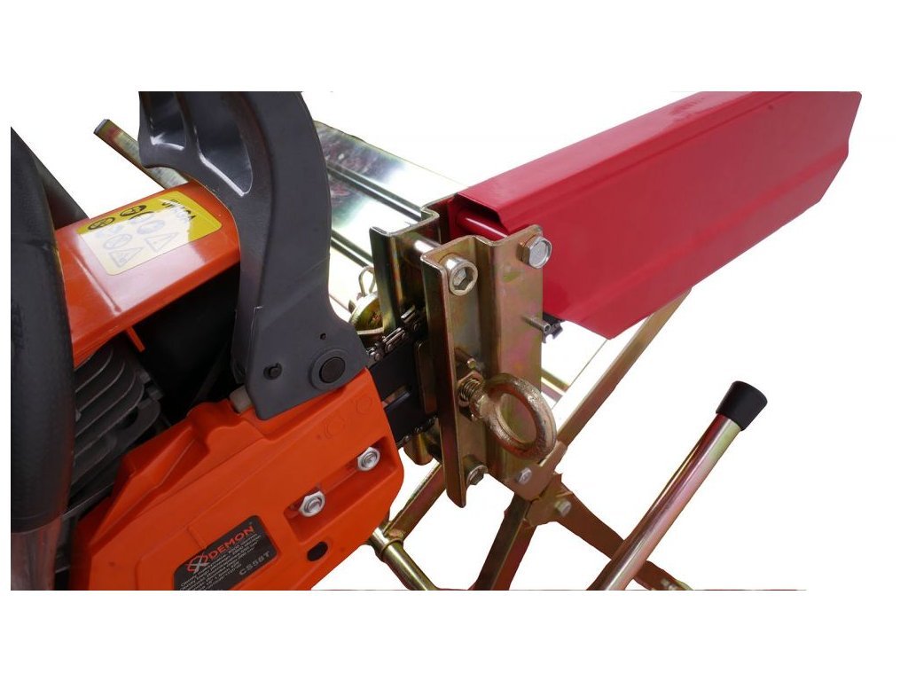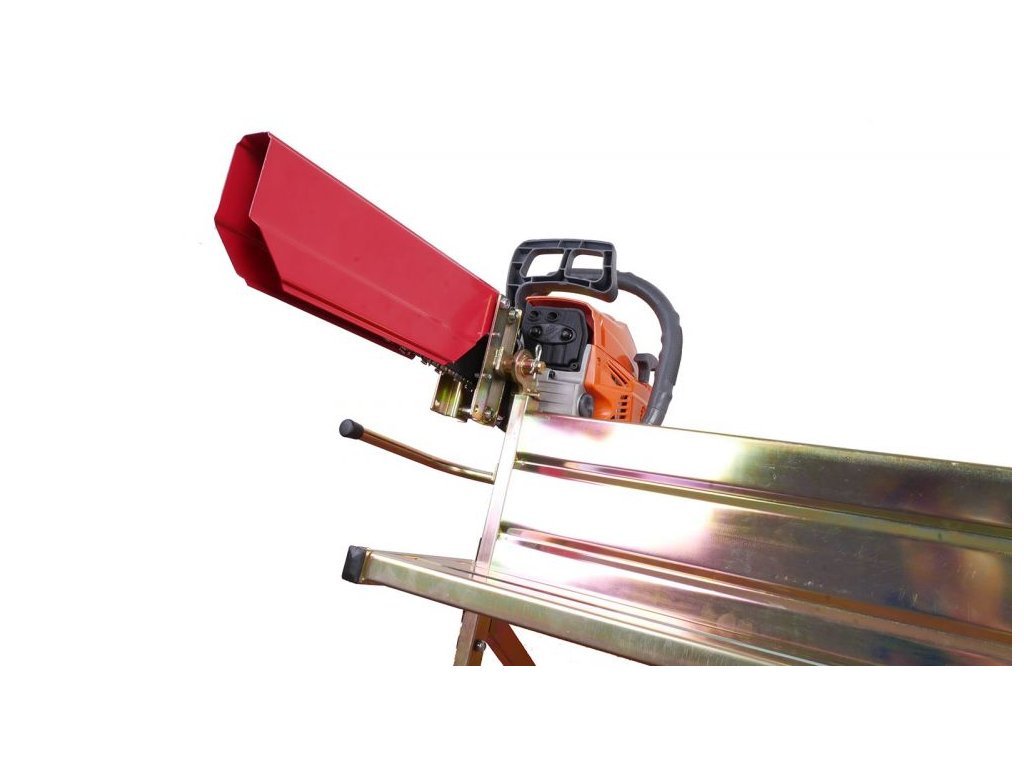 Tato celokovová skládací koza je vybavena držákem pro elektrickou, či benzínovou řetězovou pilu. S touto sestavou budete řezat dřevo pohodlně a hlavně bezpečně, neboť pila je upnuta v držáku a stačí ji ovládat jen jednou rukou. Pila v držáku je navíc kryta bezpečnostním krytem, který zamezí styku ruky s řetězem. Druhou volnou ruku lze využít k lepšímu držení dřeva.