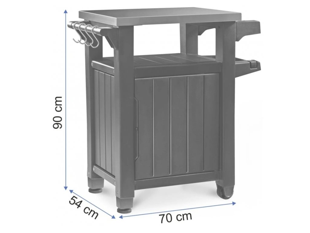 Díky modernímu vzhledu s povrchem imitujícím dřevo se skříňka skvěle hodí do jakéhokoliv prostředí – od rustikálních zahrad až po moderní terasy. Nerezová pracovní deska je nejen elegantní, ale především praktická – ideální pro přípravu a servírování jídel.