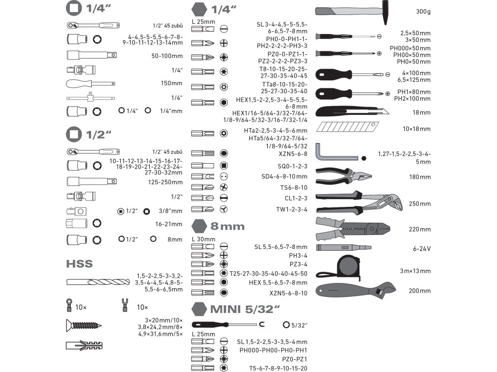 | šroubovák: | (-)4x100mm, (-)6,5x125mm, PH1x80mm, PH2x100mm, |