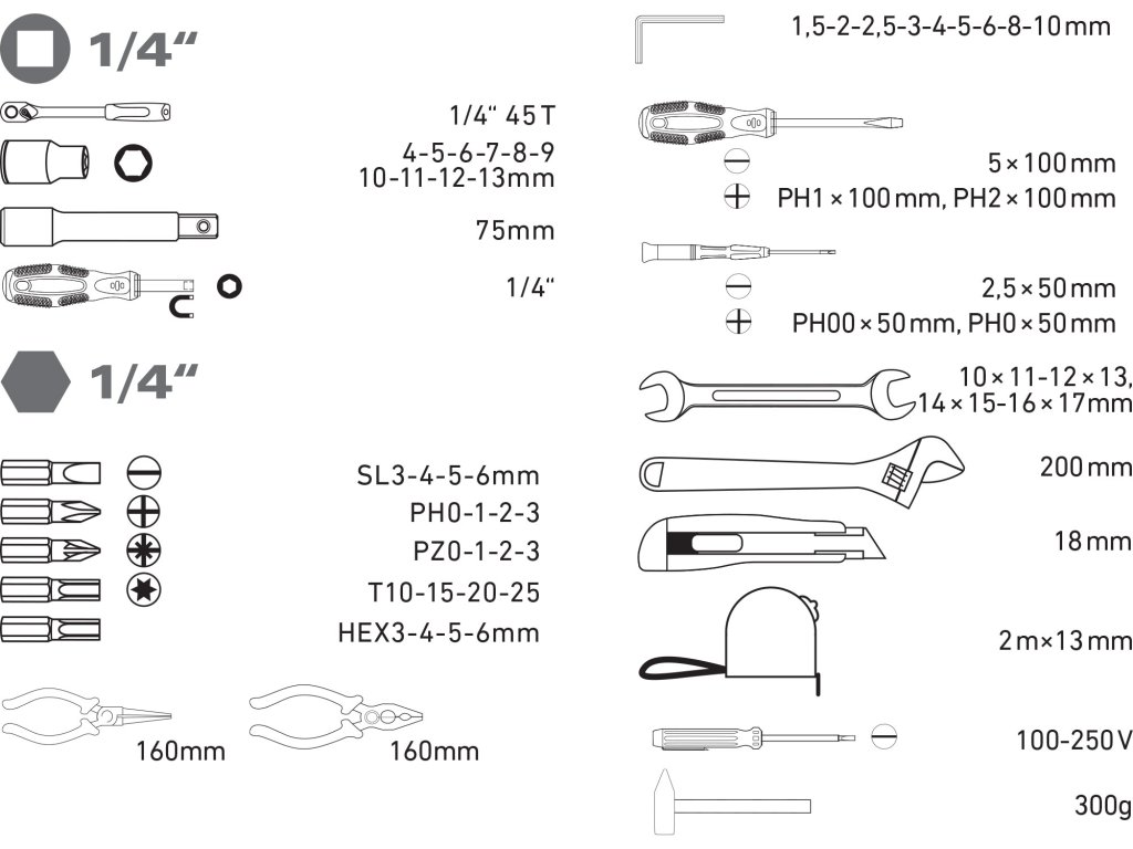 šroubovák: | PH1x100mm,PH2x100mm, (-)5x100mm (CrV), magnetický šroubovák na hroty 1/4"x100mm hodinářské šr. PH 00x50mm, PH 0x50mm, SL 2,5x50mm, zkoušečka napětí 100-250V |