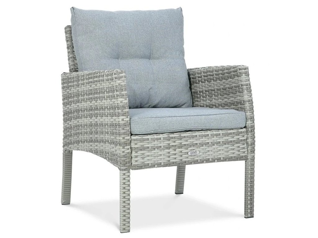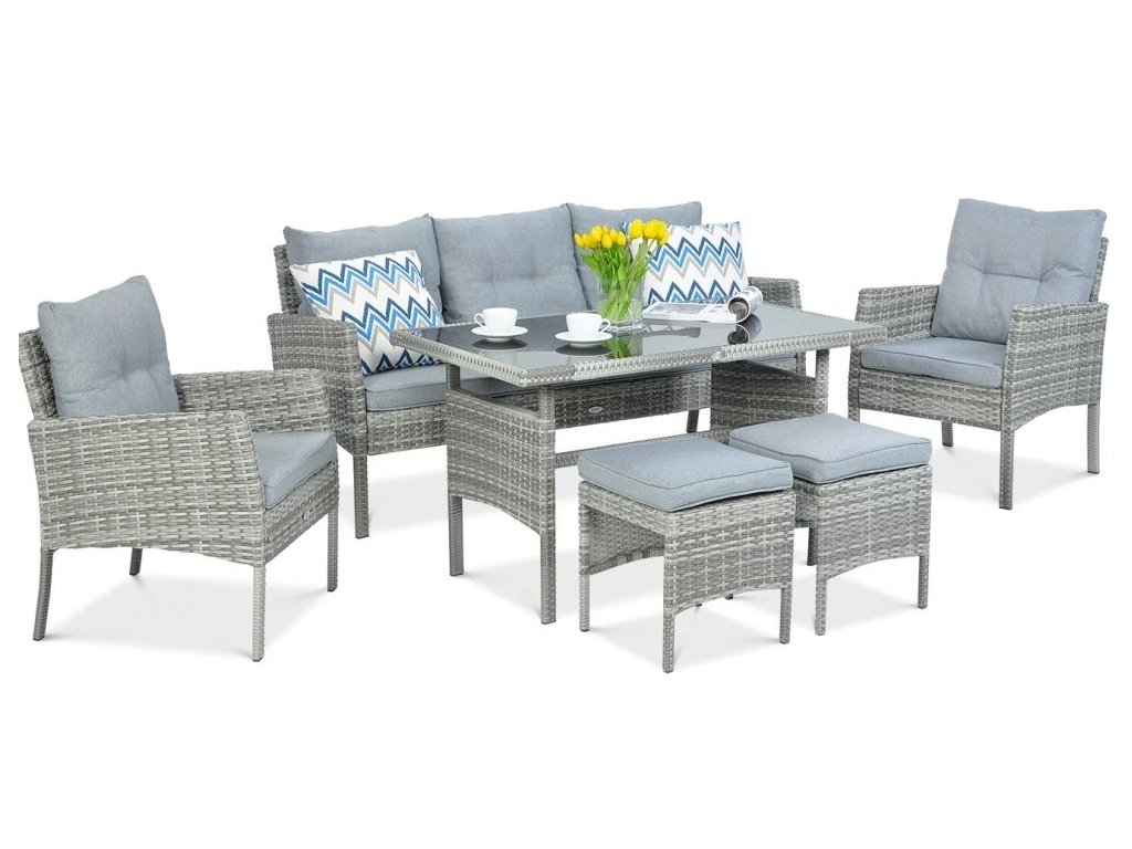 Souprava je vyrobena z kvalitního technoratanu v odstínech šedé, který působí elegantně a zároveň zajišťuje odolnost vůči povětrnostním podmínkám. Konstrukce z oceli s práškovou povrchovou úpravou dodává nábytku potřebnou stabilitu a odolnost proti korozi.