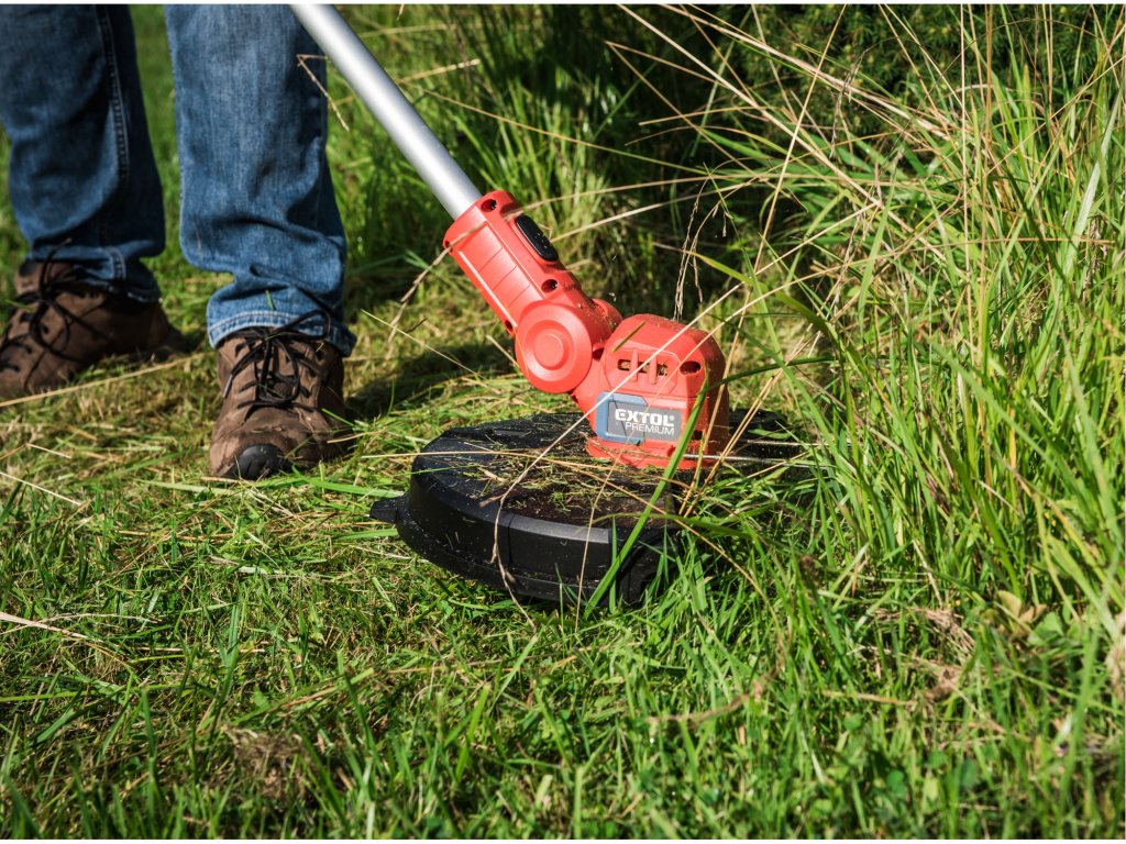 Strunová aku sekačka je určena k udržování zahradního trávníku, k úpravě okrajů trávníku a sekání trávy v těžko přístupných místech, např. u obrubníků, pod lavičkami, kolem stromů a keřů apod., které je obtížné či nemožné vysekávat pojízdnou sekačkou. Na hlavě sekačky si můžete nastavit její úhel a také ji otočit o 180° což usnadňuje sekání u okrajů trávníků, podél chodníků, příjezdových cest apod. Rukojeť sekačky lze prodloužit až o 23cm, takže s ní mohou pohodlně sekat lidé všech velikostí. Strunu lze prodloužit buď manuálně stiskem tlačítka na sekací hlavě nebo při práci, poklepem o zem. Ochranný kryt struny je vybaven nožem, který automaticky ořízne strunu na patřičnou délku. Díky napájení z baterie již není nutné dávat pozor na napájecí kabel, sekačka je tak lehčí a manipulace s ní pohodlnější. Pogumovaná rukojeť brání vysmeknutí, tlumí vibrace a zpříjemňuje držení při práci. Sekání podél plotů, zdí nebo stromů usnadňuje sklopitelný distanční oblouk, který zároveň šetří sekací strunu. Všechny akumulátory jsou vybaveny ukazatelem nabití, což umožňuje uživateli si rozvrhnout délku práce a dát si včas nabít další akumulátor. Díky Li-ion akumulátoru je možné sekačku kdykoliv dobíjet, aniž by se tím snižovala kapacita akumulátoru. Li-ion akumulátor také ztrácí energii vlivem samovybíjení velmi pomalu a vydrží dlouho nabitý.