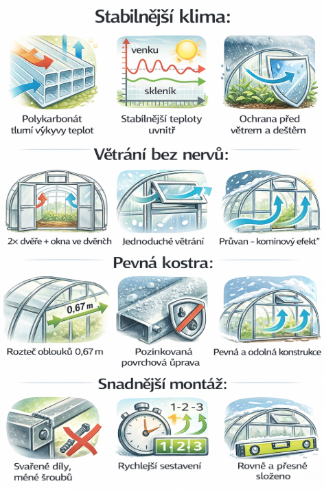 Hustší rozteč oblouků znamená lepší oporu pro polykarbonát a tužší konstrukci. V praxi je to detail, který poznáte hlavně ve větru a při běžném provozu.