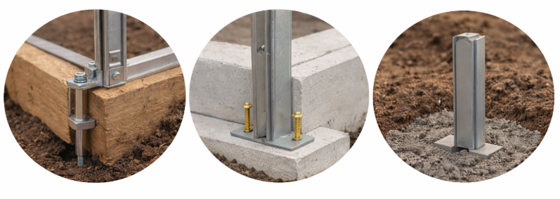 Pokud máte větrnou lokalitu nebo chcete „na roky hotovo“, pevný základ je nejlepší řešení. Skleník se pak obvykle kotví pomocí V profilů (tyto profily nebývají standardně součástí dodávky).