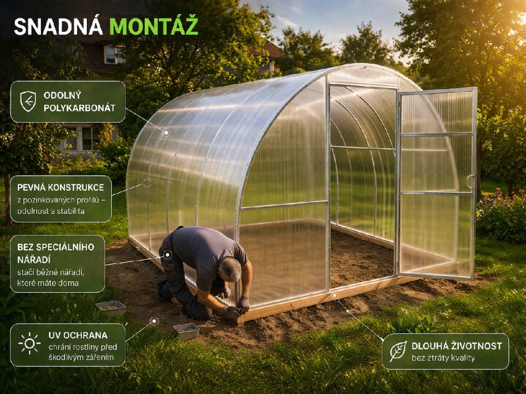 Skleník je dodáván jako kompletní stavebnice — konstrukce, polykarbonát i spojovací materiál. Vše potřebné pro montáž je v zásilce.