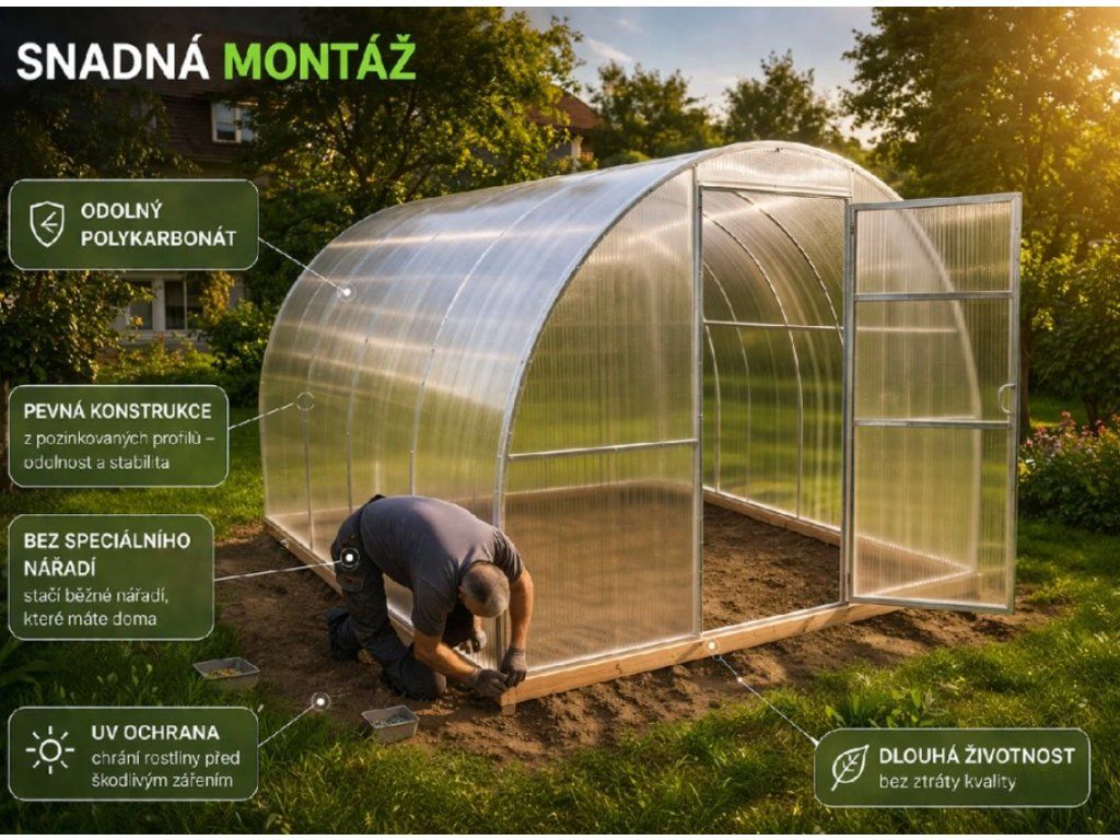 - Zákazníci kteří chtějí maximum v rámci 3×4 m — profil 40×20 mm, 6mm ARLA PLAST, střešní okno a police. Žádný kompromis. Viz celý sortiment skleníků.