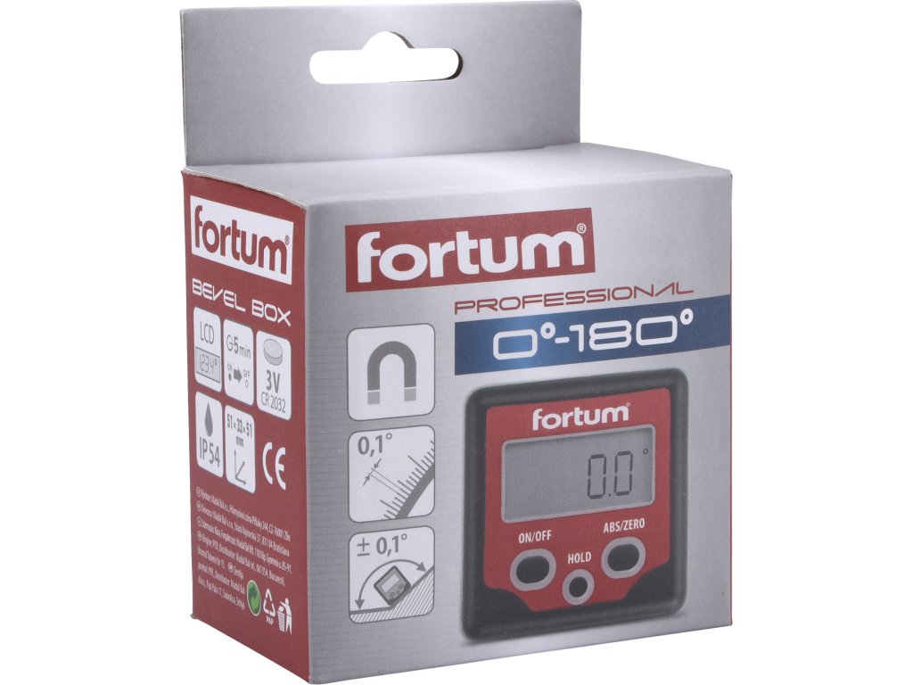 Tento digitální sklonoměr od značky Fortum je vybaven magnety pro snadné uchycení na kovové povrchy. Má rozsah měření ± 180° (0°-360°) s přesností ± 0,1° a rozlišením 0,1°, což zajišťuje přesné a spolehlivé výsledky.