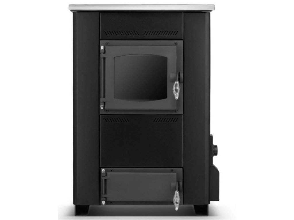 Teplovodní výměník o objemu 60 l zajišťuje efektivní přenos energie do vody s výkonem 19 kW do otopné soustavy. Zbylý výkon ohřívá přímo místnost, kde je sporák instalován. Vhodné řešení pro radiátory, případně akumulační nádrže v rodinném domě.
