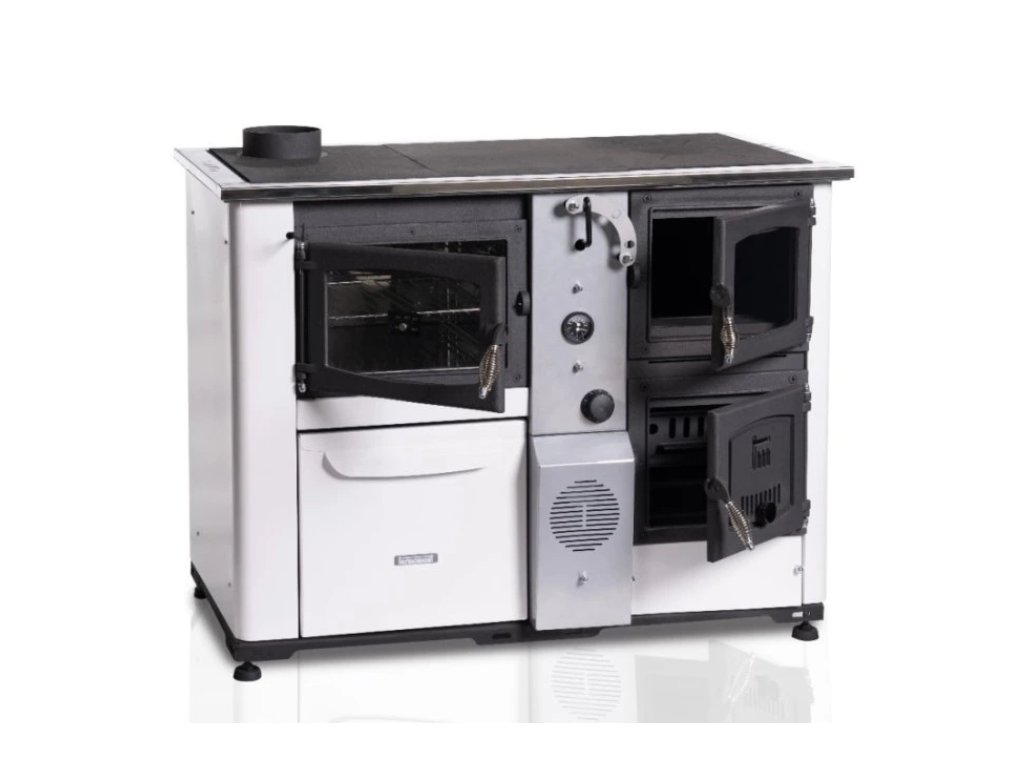 Teplovodní sporák na tuhá paliva TEMY PRO P 25 s troubou - bílý, levý