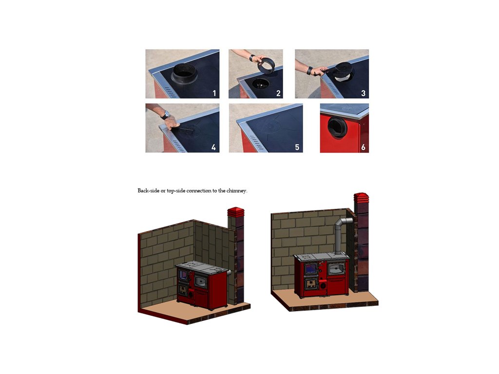 Sporák umožňuje připojení kouřovodu na levé straně – horní nebo zadní vývod, o průměru 150 mm. To výrazně usnadňuje instalaci tam, kde je komín umístěn vlevo od spotřebiče nebo kde je třeba vést kouřovod po stěně.