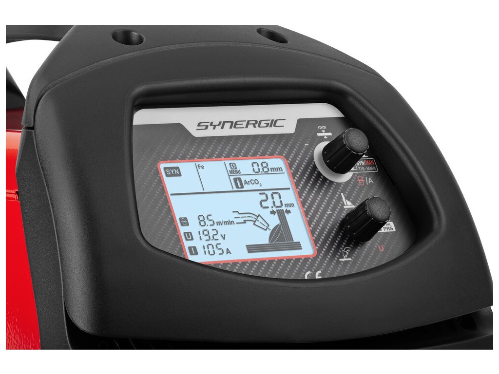 Synergické ovládání: po zadání tloušťky materiálu zařízení automaticky nastaví optimální svařovací parametry. Ty lze dále jemně upravit ručně.