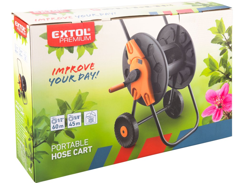 doplňující parametr: | kapacita vozíku: 60m hadice 1/2" nebo 45m hadice 5/8", hadice není součástí balení, kov. rám |
