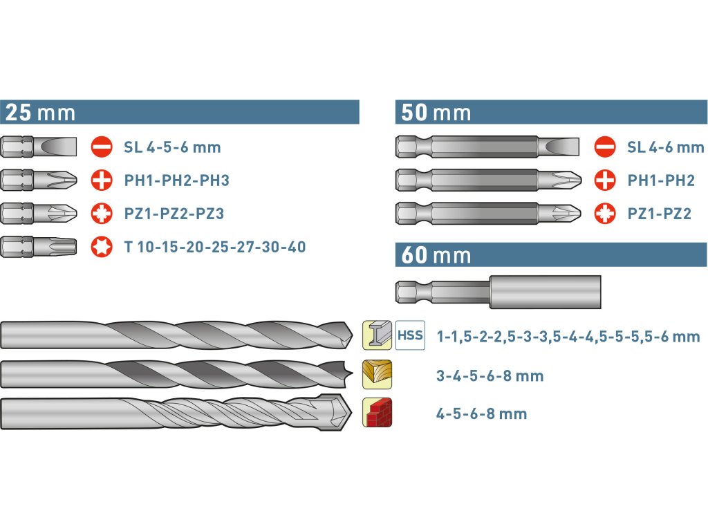 doplňující parametr: | vrtáky do kovu: O 1-1,5-2-2,5-3-3,5-4-4,5-5-5,5-6mm, vrtáky do dřeva: O 3-4-5-6-8mm, vrtáky do zdiva: O 4-5-6-8mm, hroty: 1/4"x25mm (-) 4-5-6mm, PH1-2-3, PZ1-2-3, TORX10-15-20-25-27-30-40 |