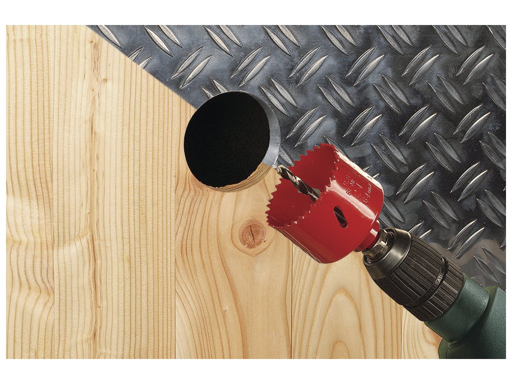 Děrovka pro dřevo, překližky, ocel, barevné kovy, plasty, sádrokartonové desky BiM, speciálně legované tělo nářadí s ozubením z rychlořezné oceli přímo použitelná - žádné zvláštní upínací trny nejsou potřeba materiál: BiM, speciálně legované tělo nářadí s ozubením z rychlořezné oceli včetně: 1 x centrovací vrták HSS, ø 6 mm