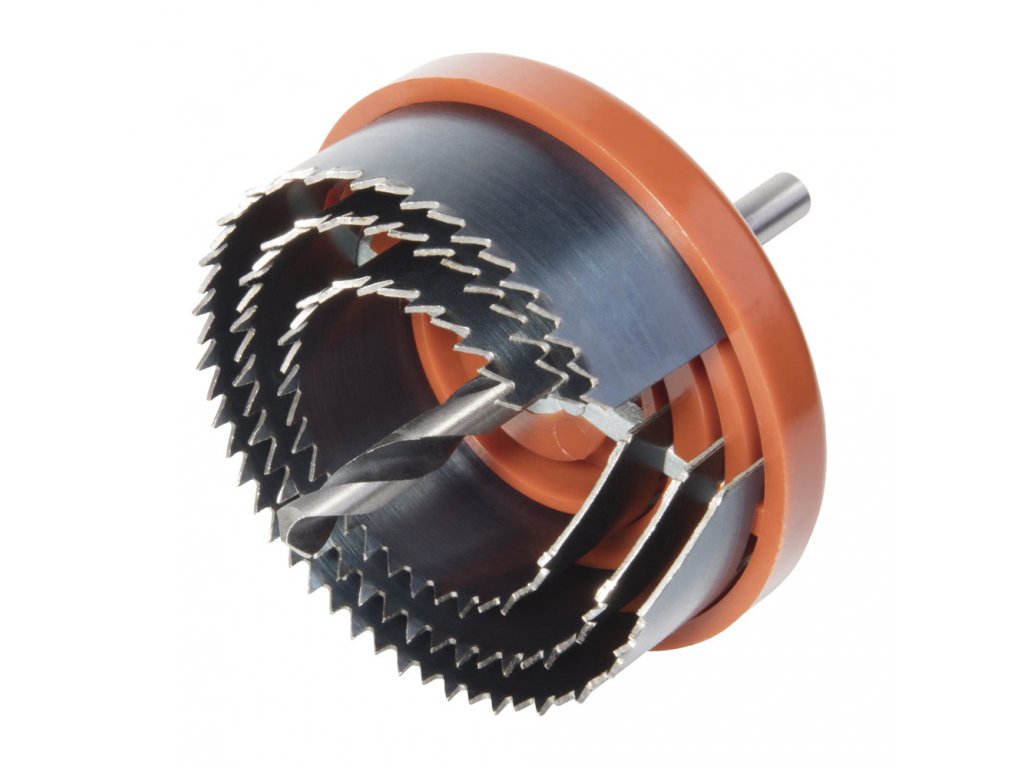 Děrovka vhodná pro dřevo, sádrokartonové desky, stavební desky plastové tělo včetně: 1 x centrovací vrták, ø 6 mm 3 x rychlovýměnné pilové nástavce
