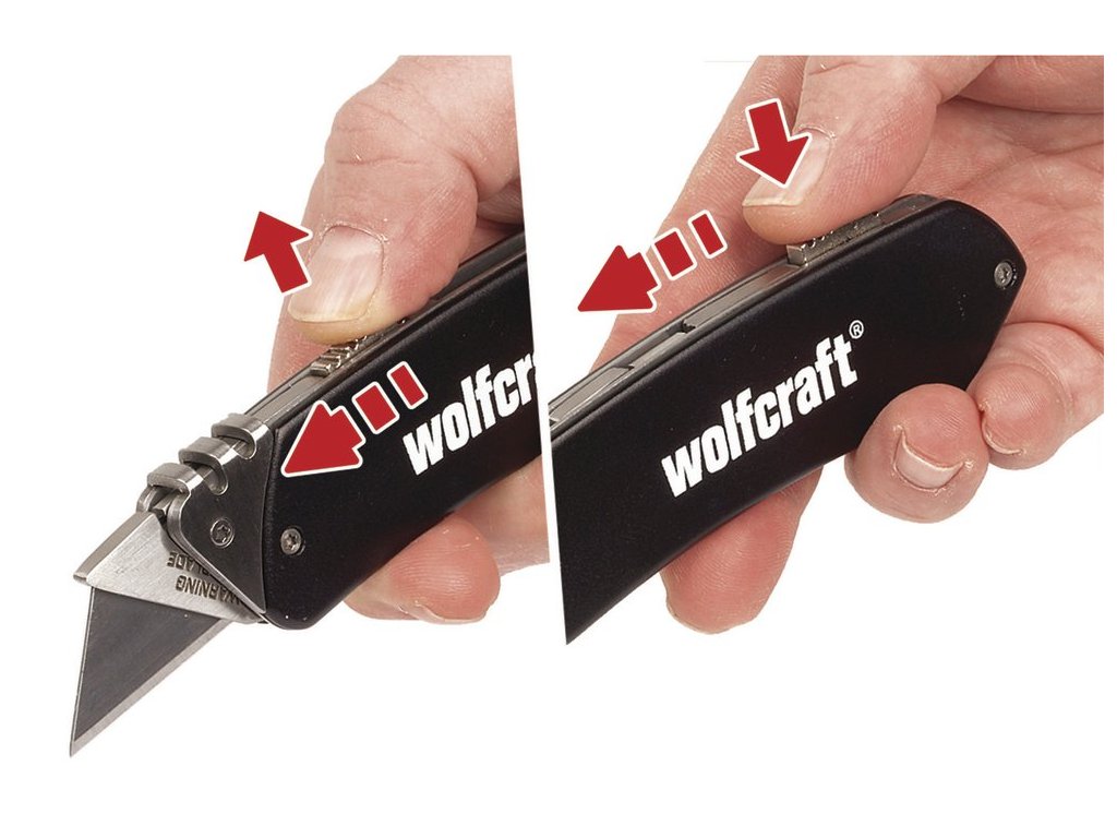Wolfcraft nůž ALU 90mm s výsuvným břitem 4124000. Pro všechny běžné lichoběžníkové čepele jednoduchá výměna čepele bez nářadí robustní, ale lehké hliníkové krytky rukojeti s klipsem na pásek aretace čepele push-lock