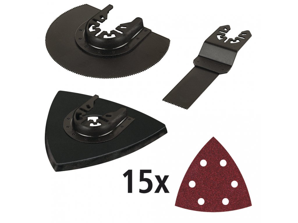 Pro přiřezávání a obrušování dřevěných konstrukcí, obsah: 1 x segmentový řezací plát, HCS, průměr 85 mm, 1 x hloubkový řezací plát, HCS, 22 mm, 1 x samodržná brusná deska, trojúhelníkový, rozměr přes hrany 95 mm, 15 x samodržné brusné listy 95 mm, Korund, vždy 5 x zrno 40, 80, 180. EAN 4006885395909 ELN1143