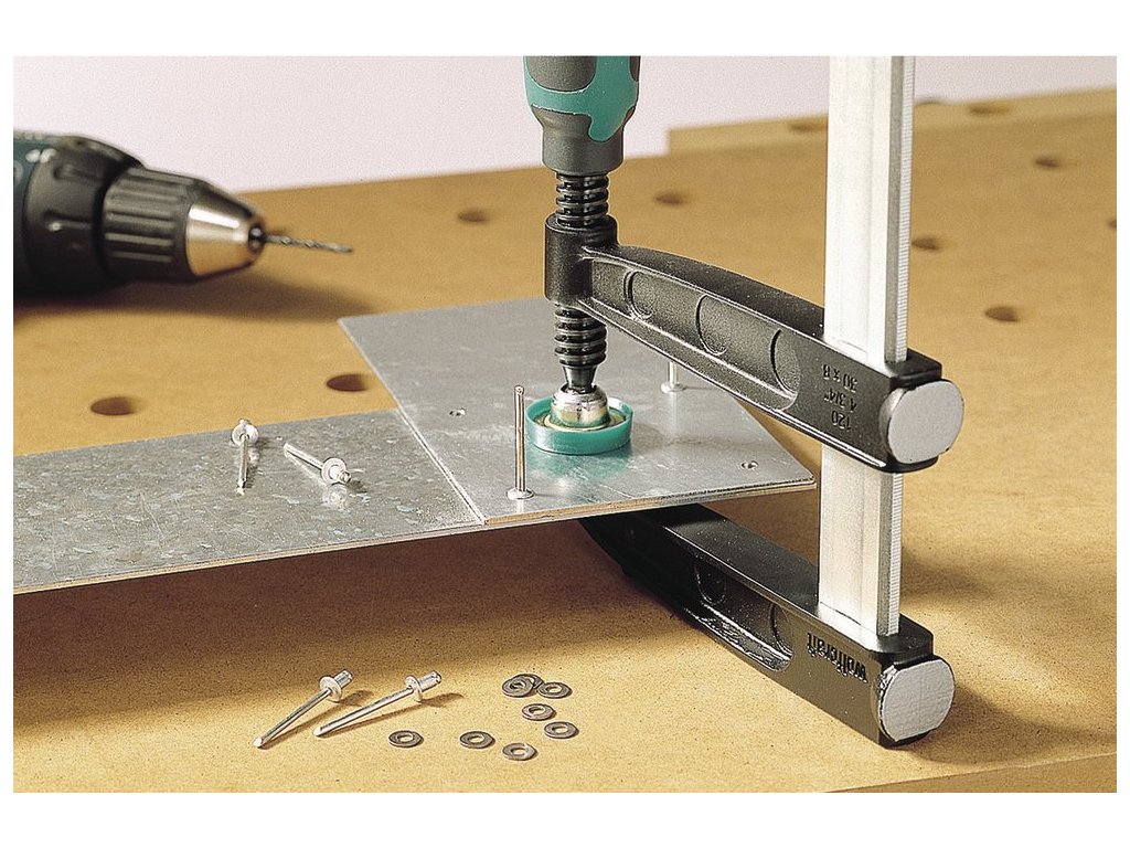 Díky hodnotným, pozinkovaným dutým profilům nedojde k deformaci upínacího posuvu ani při velkém rozsahu. Držadlo má vyložení 120 mm a upínací rozsah 450 mm.
