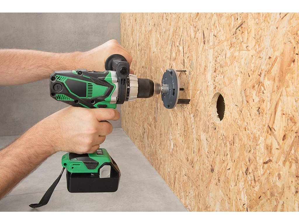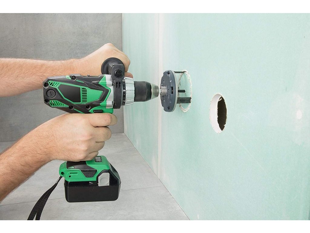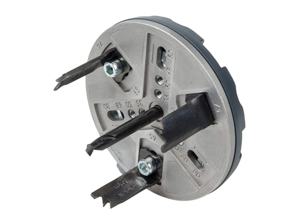 Děrovka pro standardní průměry pro vnitřní práce, integrovaná měřítka pro všechny běžné rozměry - průměr 35 mm, 50 mm, 65 mm, 68 mm, 74 mm, 80 mm, trojúhelníkové pouzdro pro všechny standardní akumulátorové vrtačky, jemné, čisté řezy přes materiály na sádrokartonu