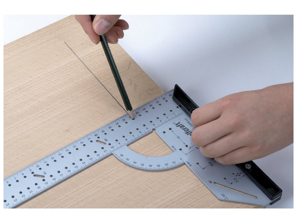 K měření, rýsování a značení, na poloměry, kruhy a miskové závěsy, vyměnitelný doraz pro přesnou práci na hranách a na plochách po obou stranách obrobku, provedení: plochý úhelník, stupnice úhloměru, paralelní rýsovací jehla, rýsovací šablona, úhlový doraz: 90°, raster: 32 mm EAN 4006885520509 ELN0948