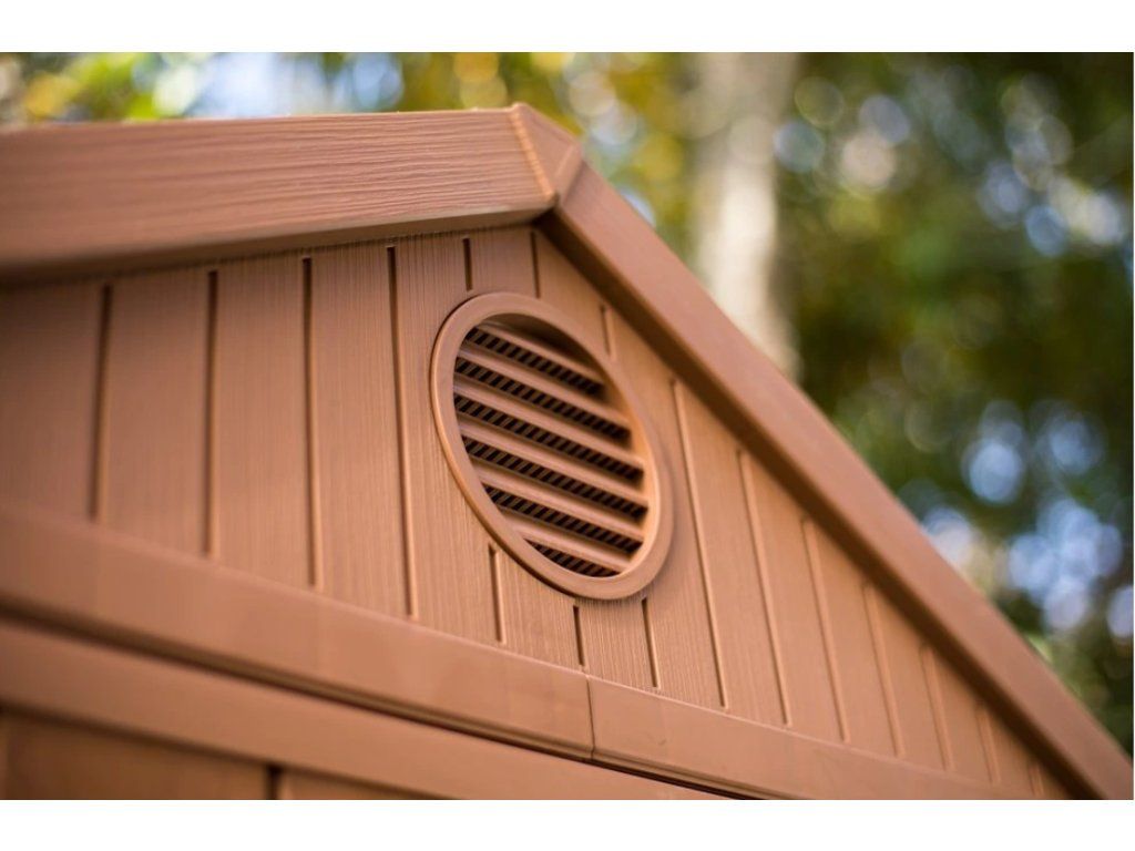 Darwin 6×6 nemá okna, ale větrací otvory v horní části stěn zajistí cirkulaci vzduchu a zabrání hromadění kondenzátu. Zahradní nářadí, chemie nebo zahradní technika zůstanou v suchu i po celém dešťovém týdnu.