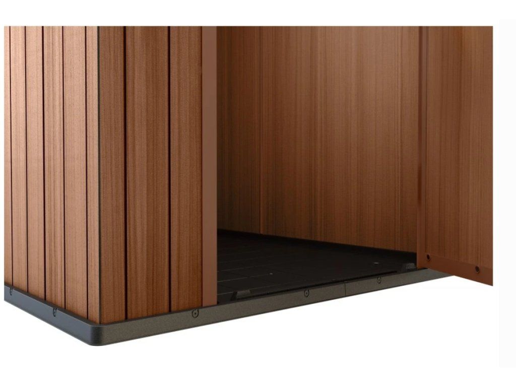 Odolný podlahový panel s nosností 150 kg/m² chrání obsah před vlhkostí ze země, bahnem, sněhem a hlodavci. Nemusíte řešit základ ani podložení — stačí rovný zpevněný povrch. Viz zahradní boxy a skříně.
