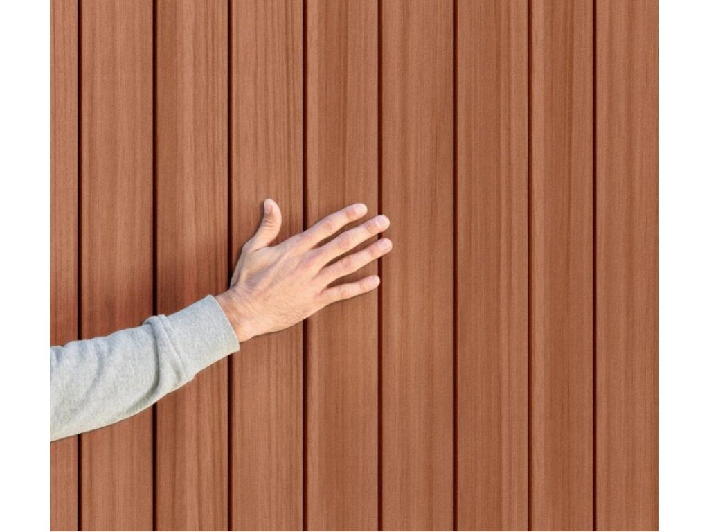 Evotech+™ je vylepšená varianta kompozitní technologie Keter — realistická hnědá textura imitující dřevo, odolnost vůči dešti, sněhu, UV záření i teplotním výkyvům bez jakékoli údržby. Materiál se neloupá, nekoroduje a nehnijí. Jednou za rok ho opláchněte hadicí — tím péče končí.