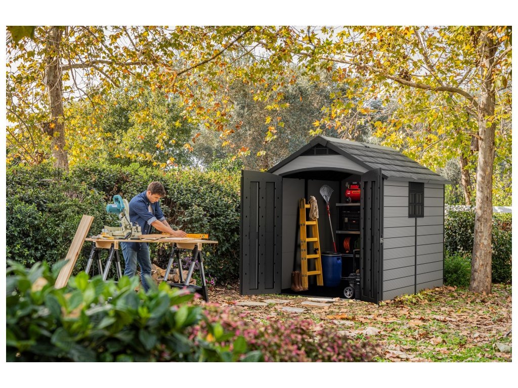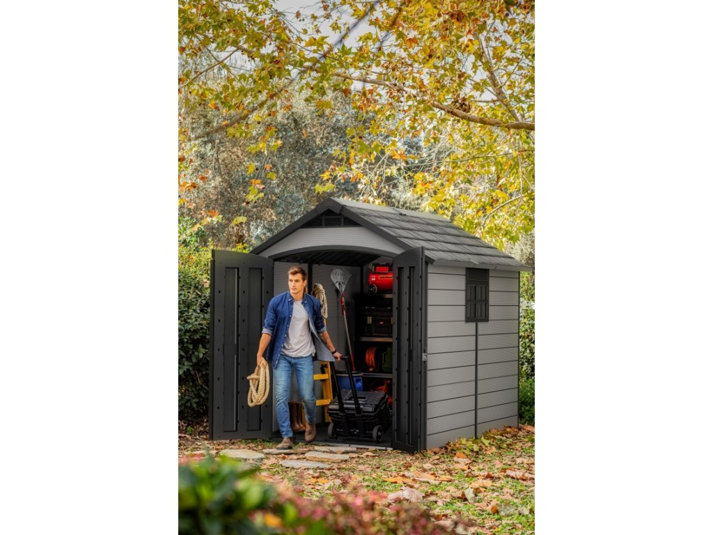 Zahradní domek Premier 759 je výbornou volbou, kde se kombinuje klasický design a výjimečná funkčnost. Premier 759 je prostorný a bezúdržbový - nerezne, nehnije, neloupe se a odolává vlivům nepříznivého počasí i UV záření. Podlahový panel chrání obsah před blátem a dešťovou vodou. Uzamykatelný s integrovanou dveřní západkou pro větší bezpečnost předmětů uvnitř. Vestavěný systém větrání pro dostatečné proudění vzduchu zabrání, aby předměty uvnitř hnily nebo plesnivěly. Díky střešnímu oknu dovnitř proniká světlo.