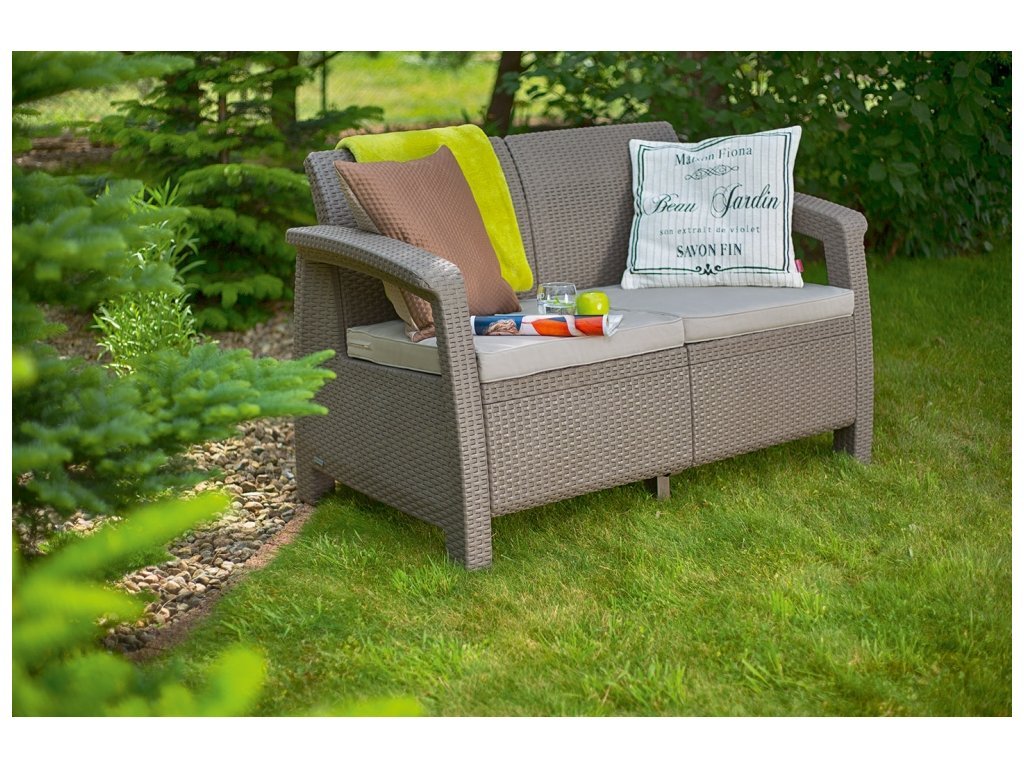 Estetická a velmi atraktivní dvoumístná pohovka CORFU LOVE SEAT je vyrobena z polypropylenu nejvyšší kvality s ozdobným ratanovým vzorem. Díky použití plastu jako hlavního materiálu je zaručena její maximální odolnost vůči povětrnostním podmínkám a pohodlné a bezproblémové používání.