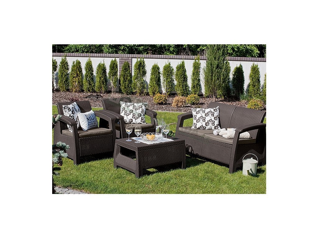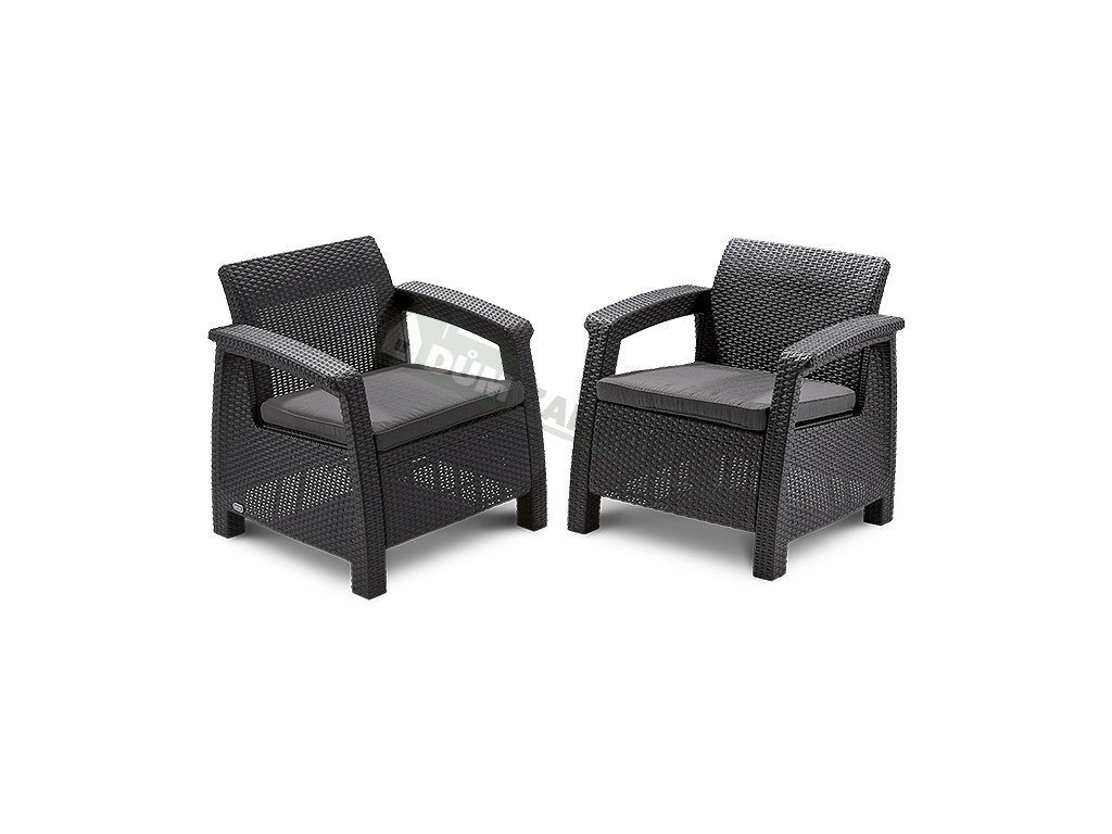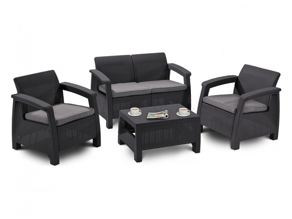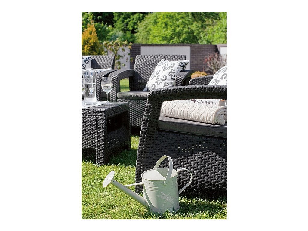 Pohodlný a estetický zahradní komplet Corfu Graphite se vyznačuje vysoce kvalitním zpracováním. Komplet v šedém prvovedení tvoří 2 křesla společně se stolkem a sofa vyrobeným z polypropylenu v imitaci příprodního ratanu. Díky použitým materiálům je komplet odolný vůči povětrnostním vlivům i UV záření. Pro větší pohodlí je komplet doplněn o polstrované sedáky a opěrky v šedém provedení. Tato sestava nábytku Allibert Corfu Graphite je idálním doplňkem pro pohodlné trávení času v zahradách nebo na terasách.