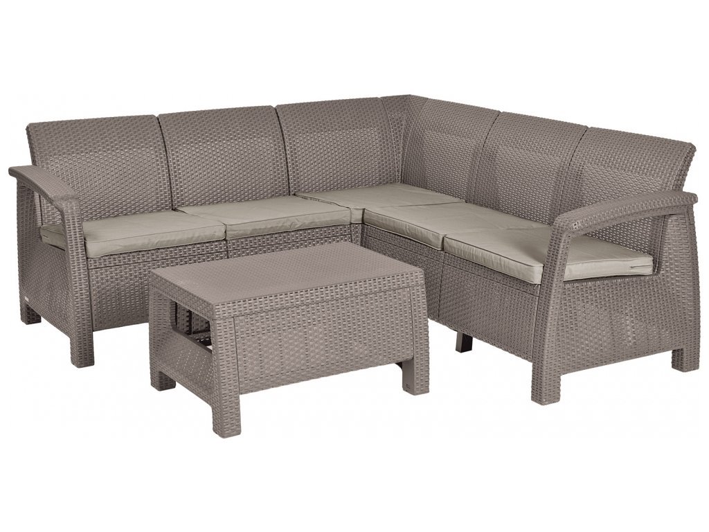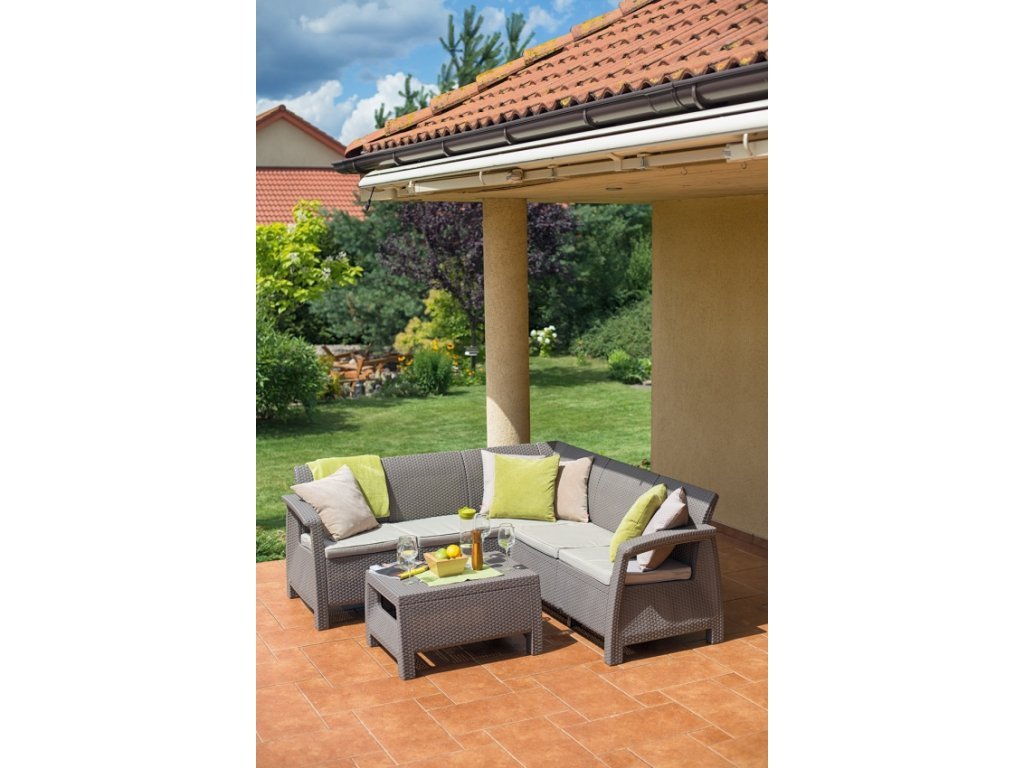 Elegantní a funkční komplet Corfu Relax značky Keter/Allibert. Lehká ale stabilní a pevná konstrukce se vyznačuje vysokou kvalitou použitých materiálů a souprava Corfu Relax není výjimkou. Kromě kvalitního materiálu přináší také nádherný vzhled a vysokou odolnost. Souprava se skládá z rohového sofa s pohodlně tvarovanými zády a stylového stolku a je dodávaná včetně pohodlných podsedáků.