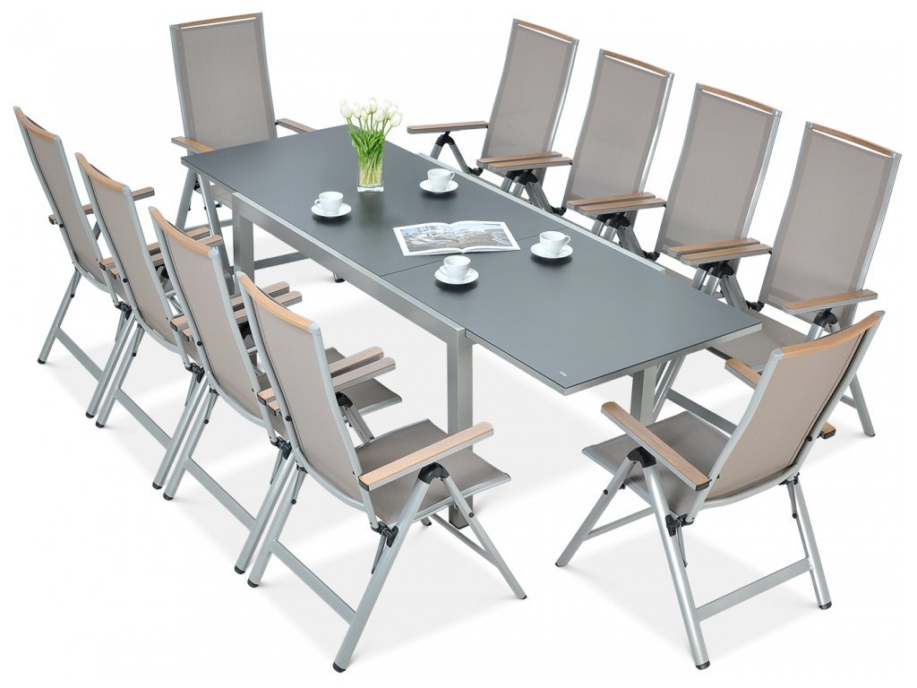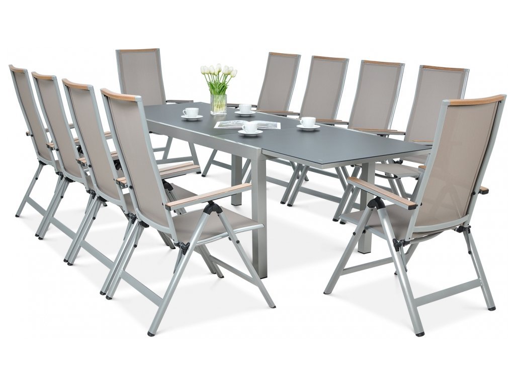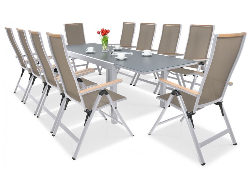 Působivá sada BRISBANE pro 10 osob je nábytek, jehož konstrukce je vyrobena z hliníku a sedák a opěradlo židlí jsou opatřeny textilní tkaninou v barvě taupe, která zajišťuje pohodlí bez potřeby polštářů. Kromě toho lze židle plně sklopit se 6-stupňovým nastavením opěradla. Područky a horní lišta s dekorem napodobujícím přírodní dřevo dodávají židlím stylový vzhled. Deska stolu je roztažitelná až na 250 cm a je vyrobena ze silného tvrzeného skla. Sada Brisbane se vyznačuje vysokou odolností vůči povětrnostním podmínkám a UV záření. Nábytek je určený pro vnější a vnitřní použití.