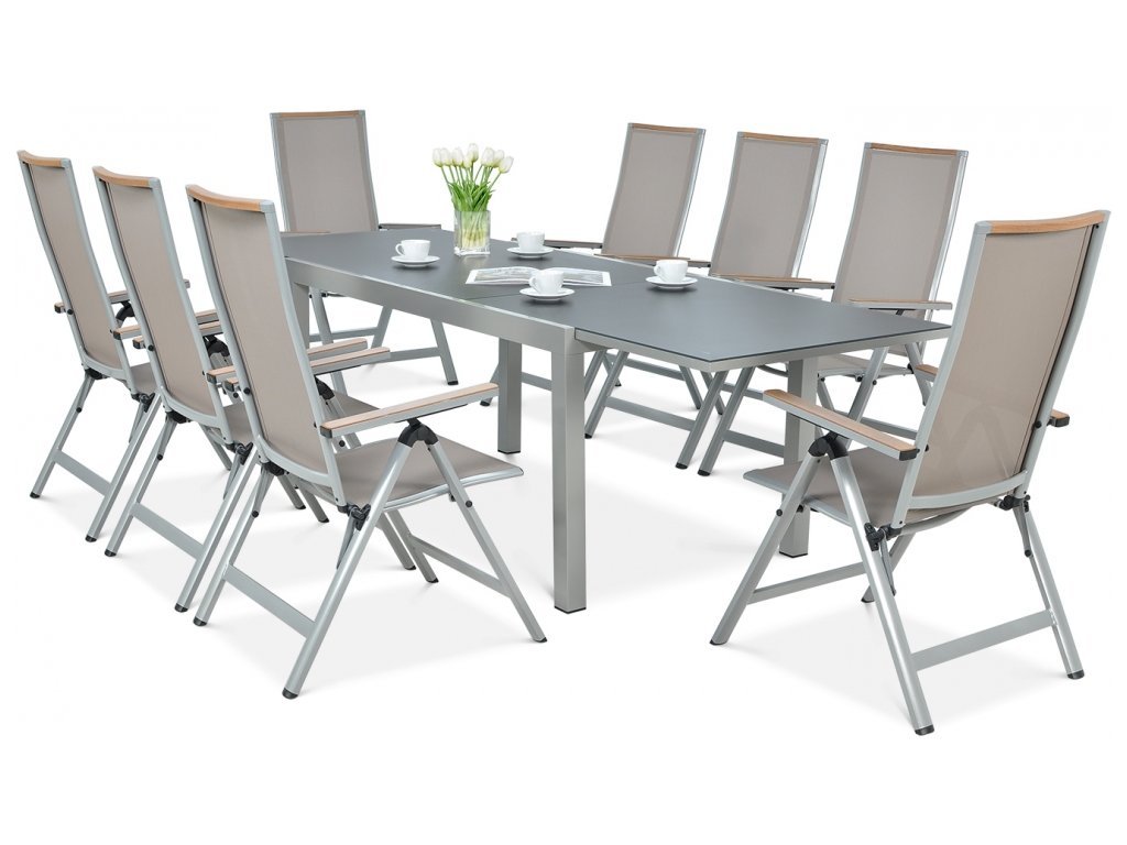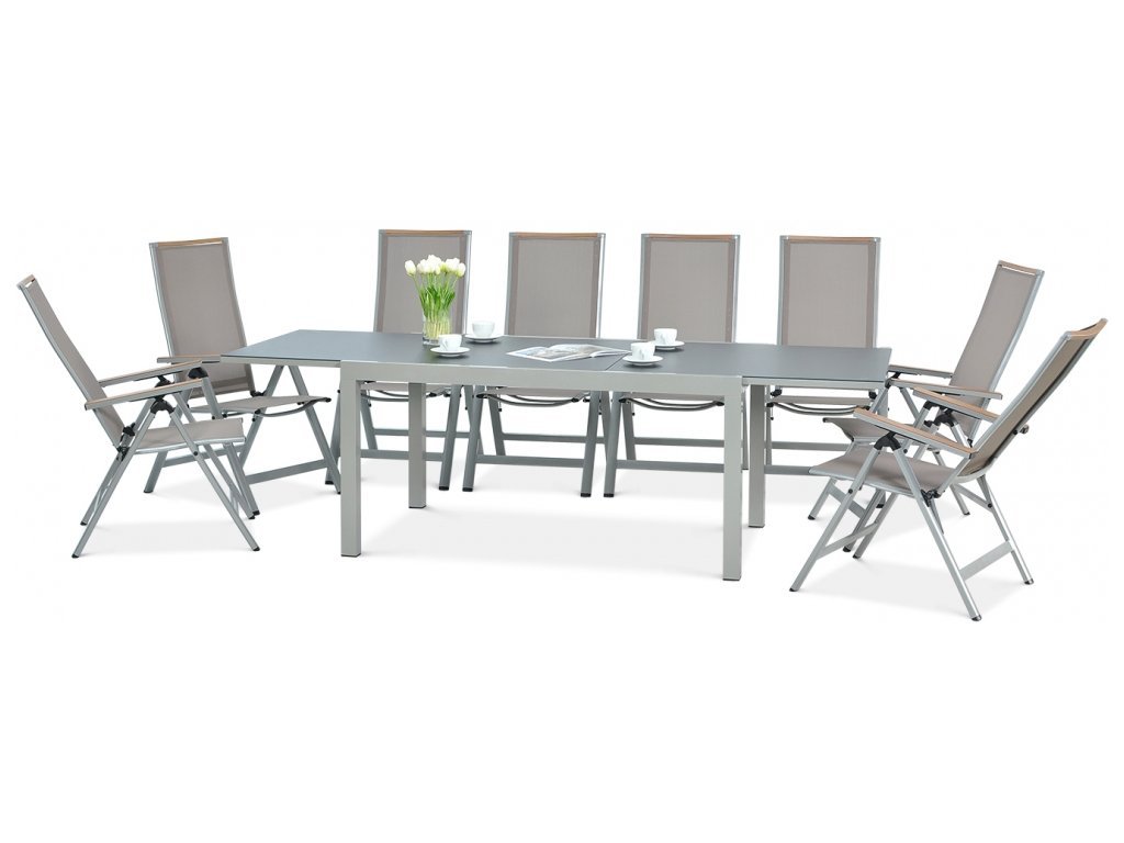 Působivá sada BRISBANE pro 8 osob je nábytek, jehož konstrukce je vyrobena z hliníku a sedák a opěradlo židlí jsou opatřeny textilní tkaninou v barvě taupe, která zajišťuje pohodlí bez potřeby polštářů. Kromě toho lze židle plně sklopit se 6-stupňovým nastavením opěradla. Područky a horní lišta s dekorem napodobujícím přírodní dřevo dodávají židlím stylový vzhled. Deska stolu je roztažitelná až na 250 cm a je vyrobena ze silného tvrzeného skla. Sada Brisbane se vyznačuje vysokou odolností vůči povětrnostním podmínkám a UV záření. Nábytek je určený pro vnější a vnitřní použití.